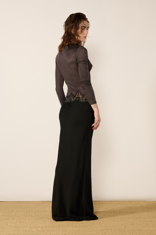 Maxi dress crafted from stretch ribbed knit fabric in Carbon colour, with Verner lace, by Christopher Esber.