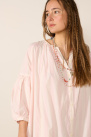It features a long, loose fit with a full-length button closure, dropped shoulders, slightly puffed mid-length sleeves, and discreet pockets.