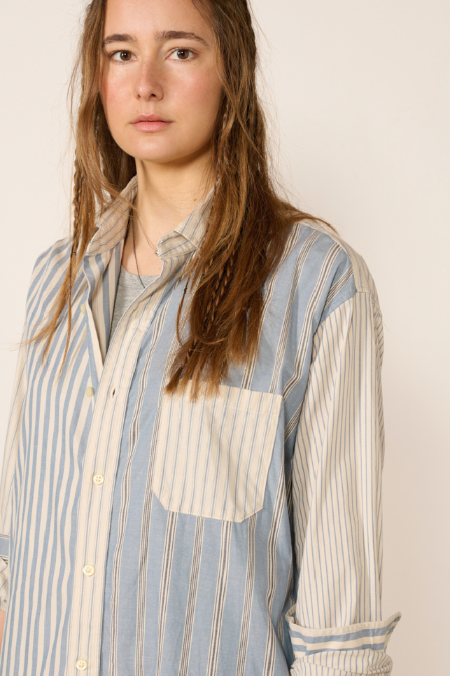 It features a loose, relaxed silhouette with a classic collar, a chest pocket on the left side, discreetly integrated side pockets, a full button-down closure, and a slightly longer back hem.