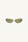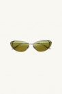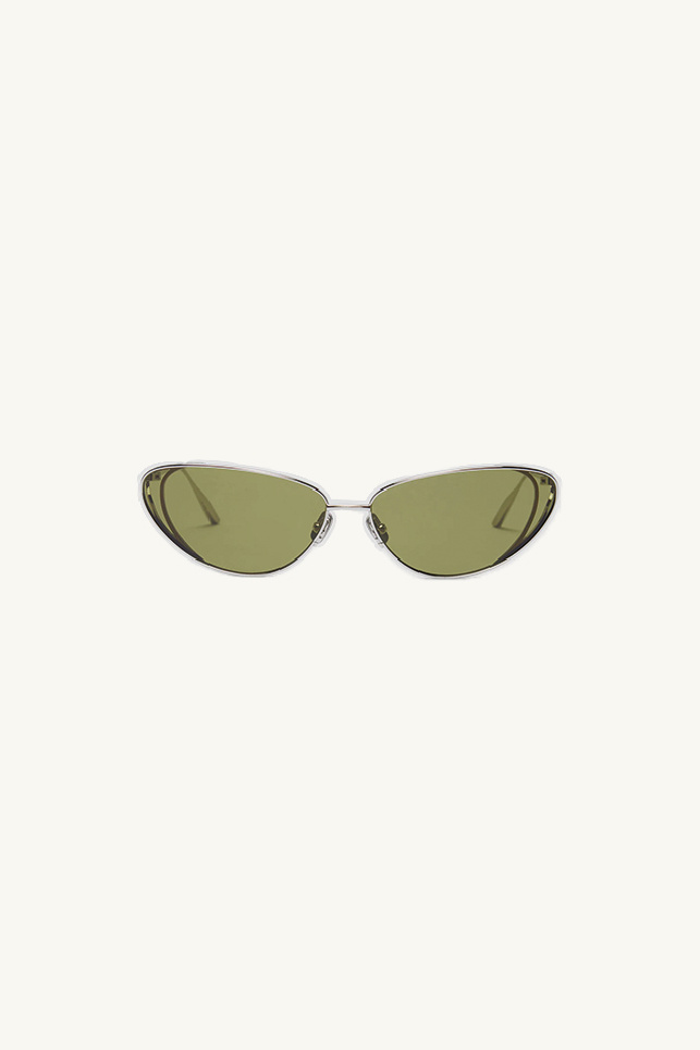 They offer a sleek minimalist design, with olive-colored lenses and raised silver frames.