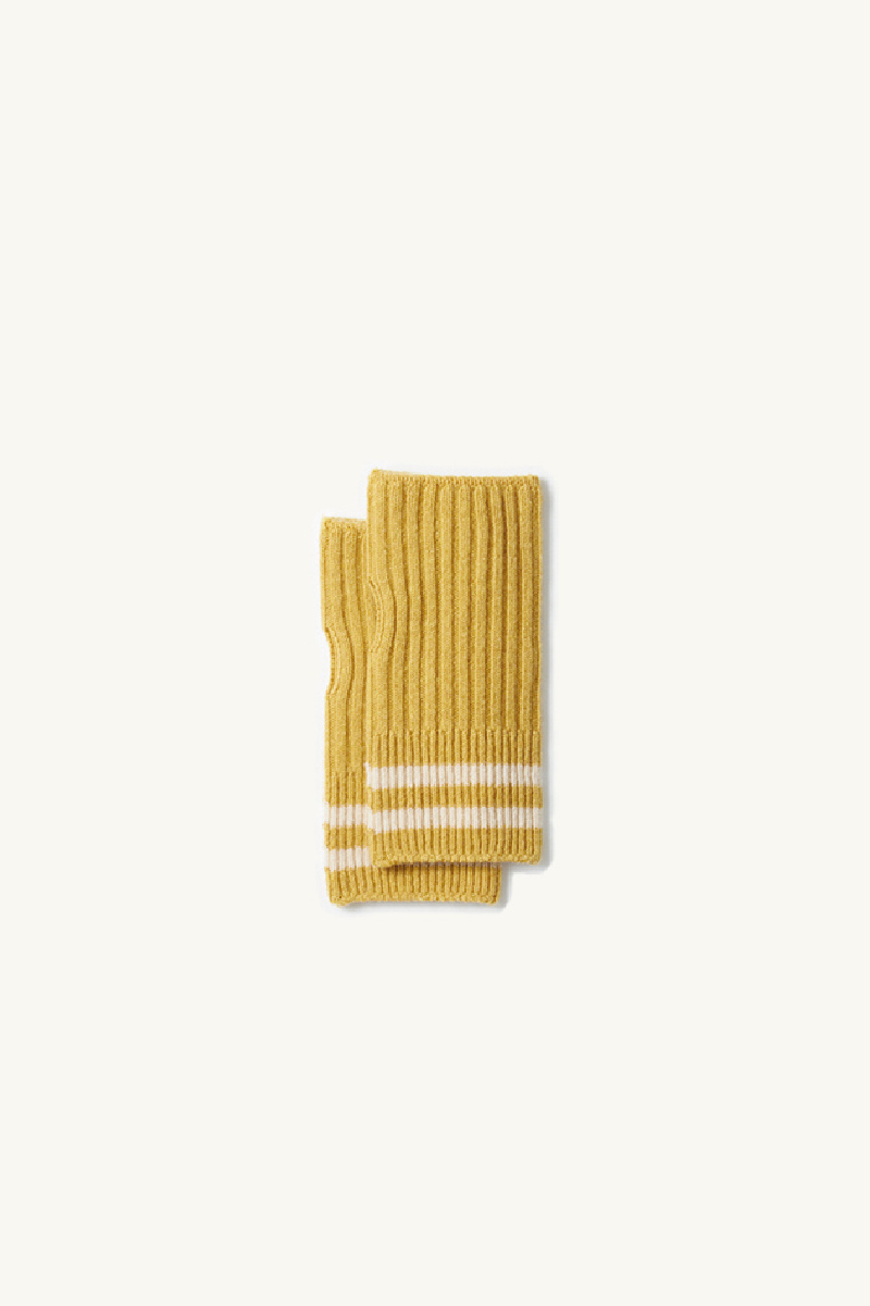 Yellow knitted mittens made from a blend of wool and acrylic with stripes, by Rototo.