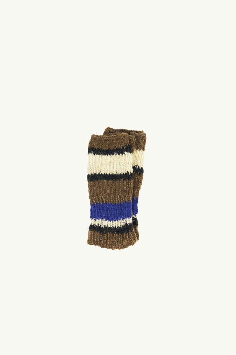 Both robust and delicately textured with a Jersey Stitch, they are available in brown, black, blue and off-white stripes. Ribbed cuff.