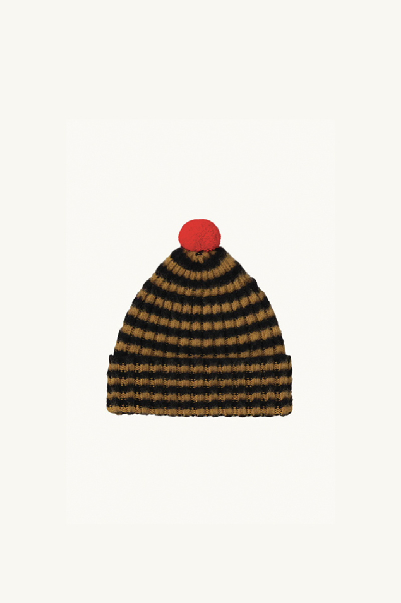 This black and bouillon ribbed beanie features a slightly pointed shape, adorned with a contrasting red pom-pom. It's knitted in a brushed plain yarn, offering a soft, comfortable seamless texture, with a cuff for a perfect fit. One size fits all.