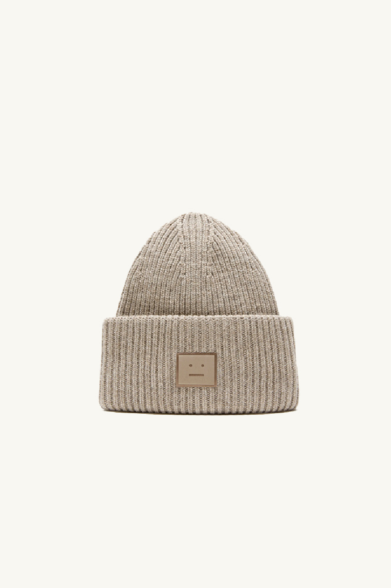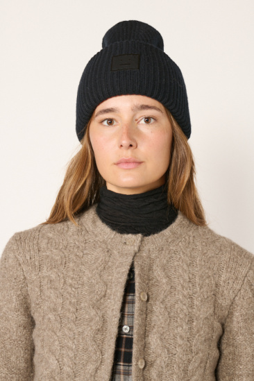 It offers wide ribbed turned edges adorned with a large tone-on-tone badge.