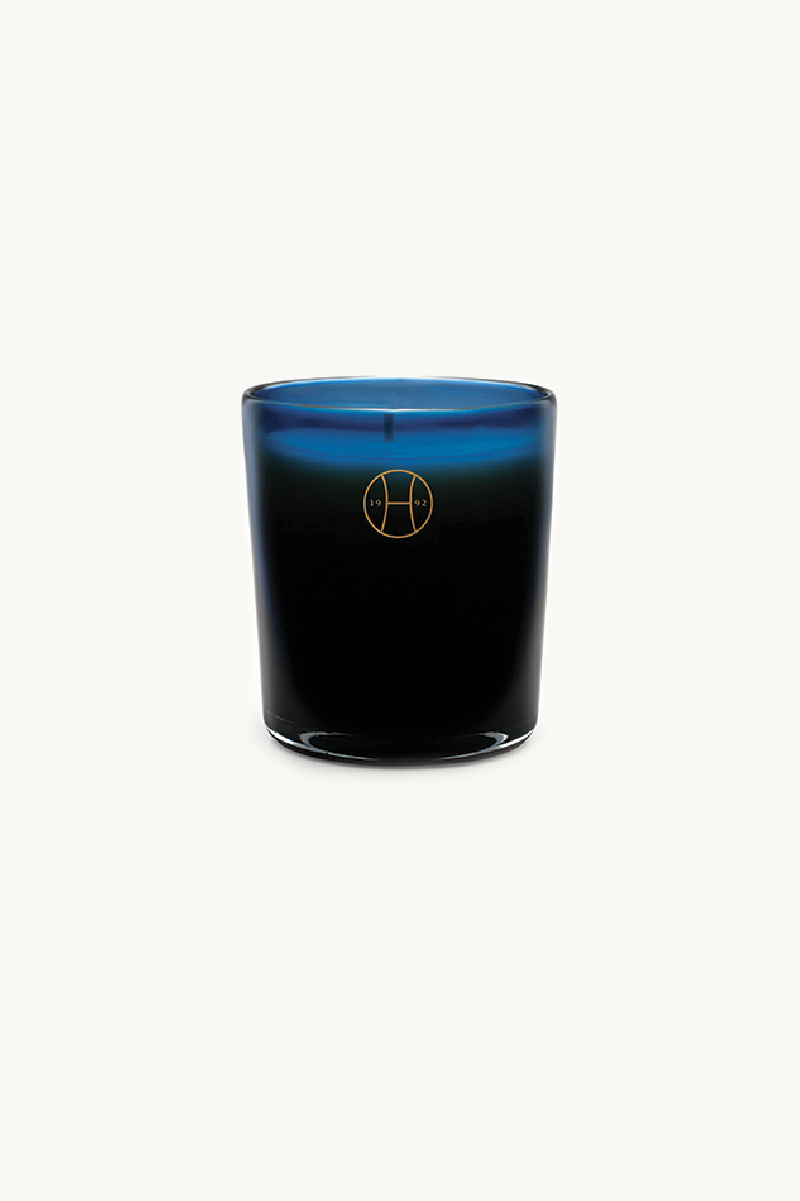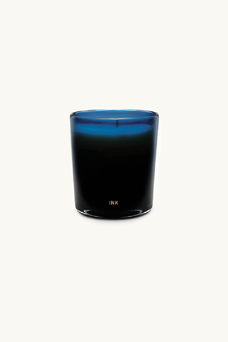 Ink candle, by Perfumer H, the element, juniper, and cedar wood, assembled with papyrus, vetiver and incense creating a texture of blue ink on white paper.