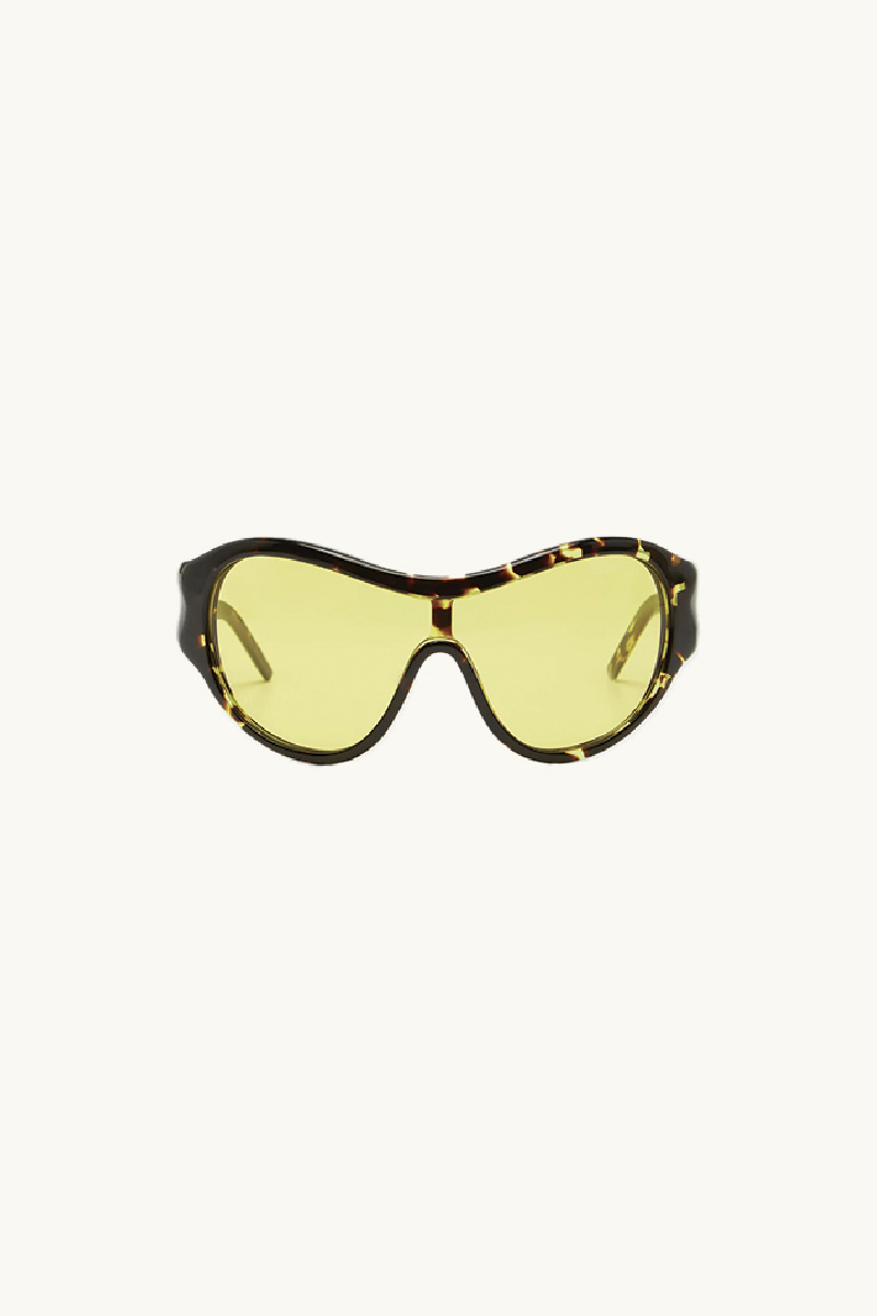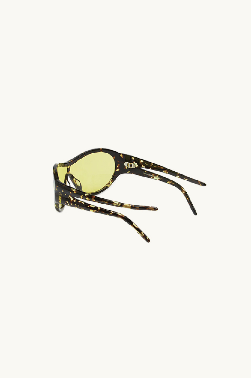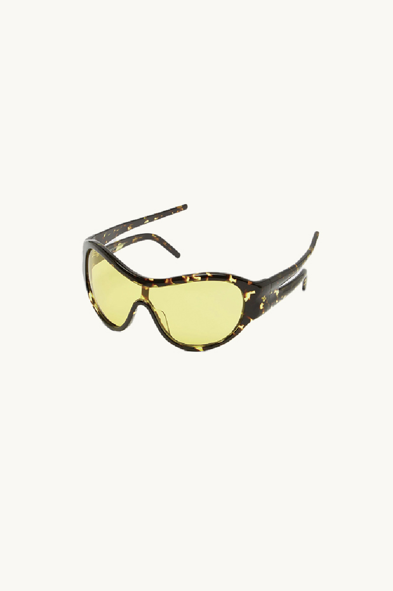 Featuring a futuristic design with oversized yellow lenses and a curved tortoiseshell frame. Each side is equipped with an additional temple arm that keeps the sunglasses in place, doubling as a headband when worn up.
