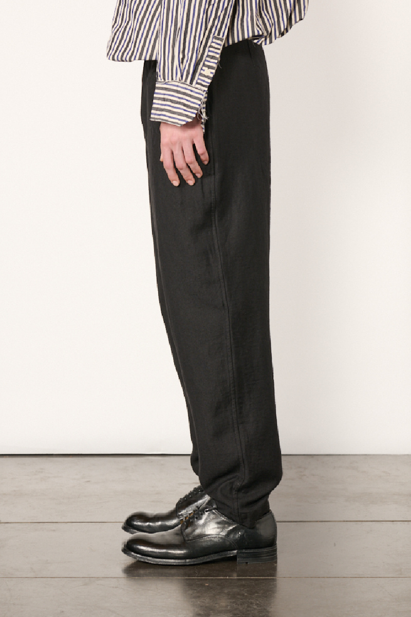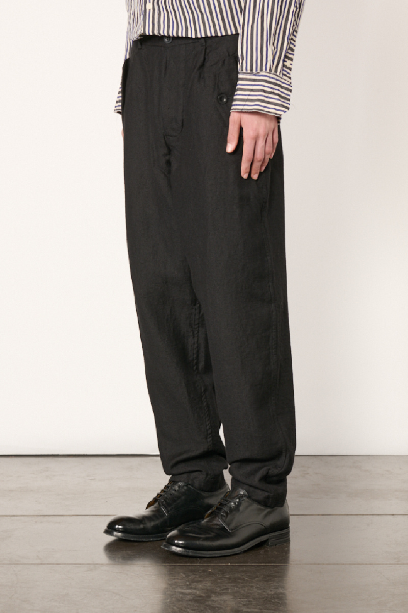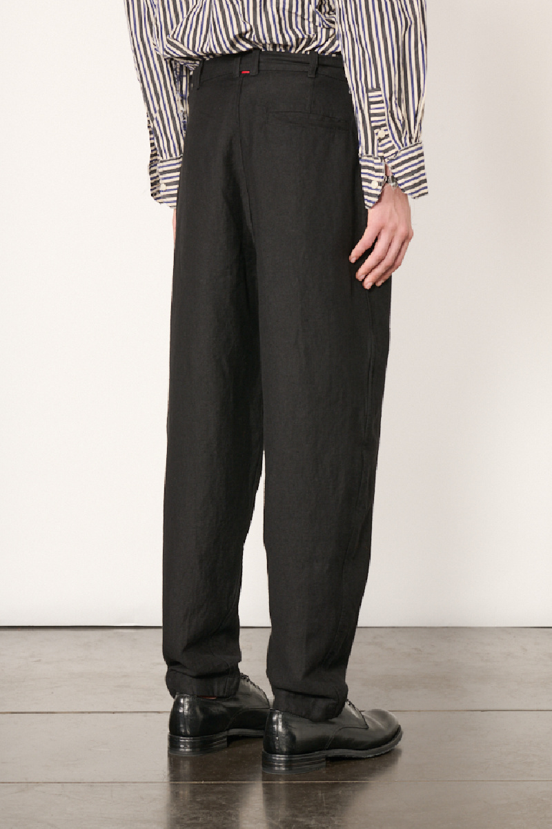 Hiroshi trousers made from a blend of black linen and virgin wool, slightly textured and partially lined, from the Casey Casey brand.