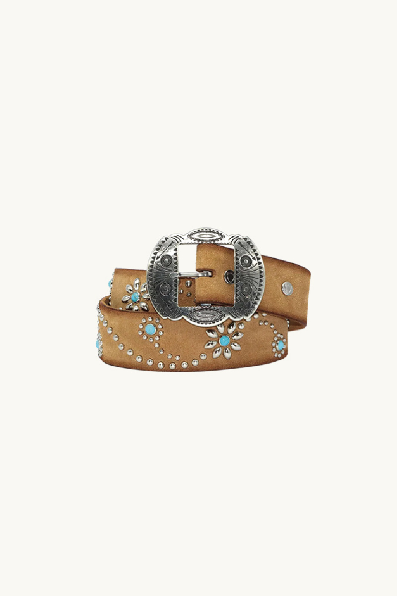 Featuring a large engraved buckle, it is embellished with floral-inspired stud details and small turquoise stones, blending western spirit with refined elegance.