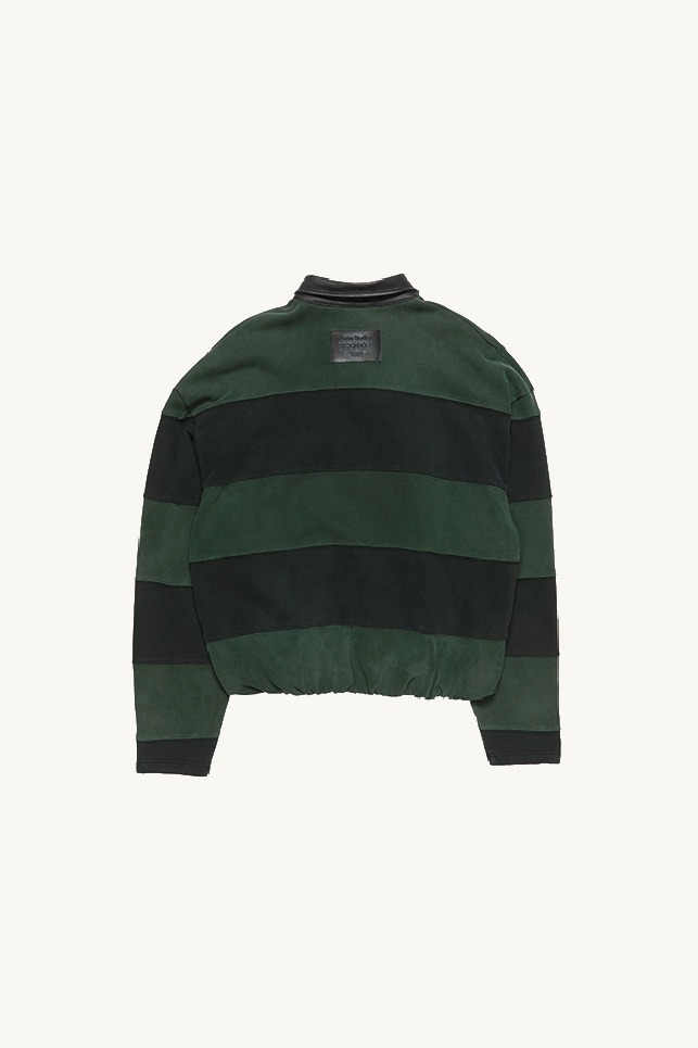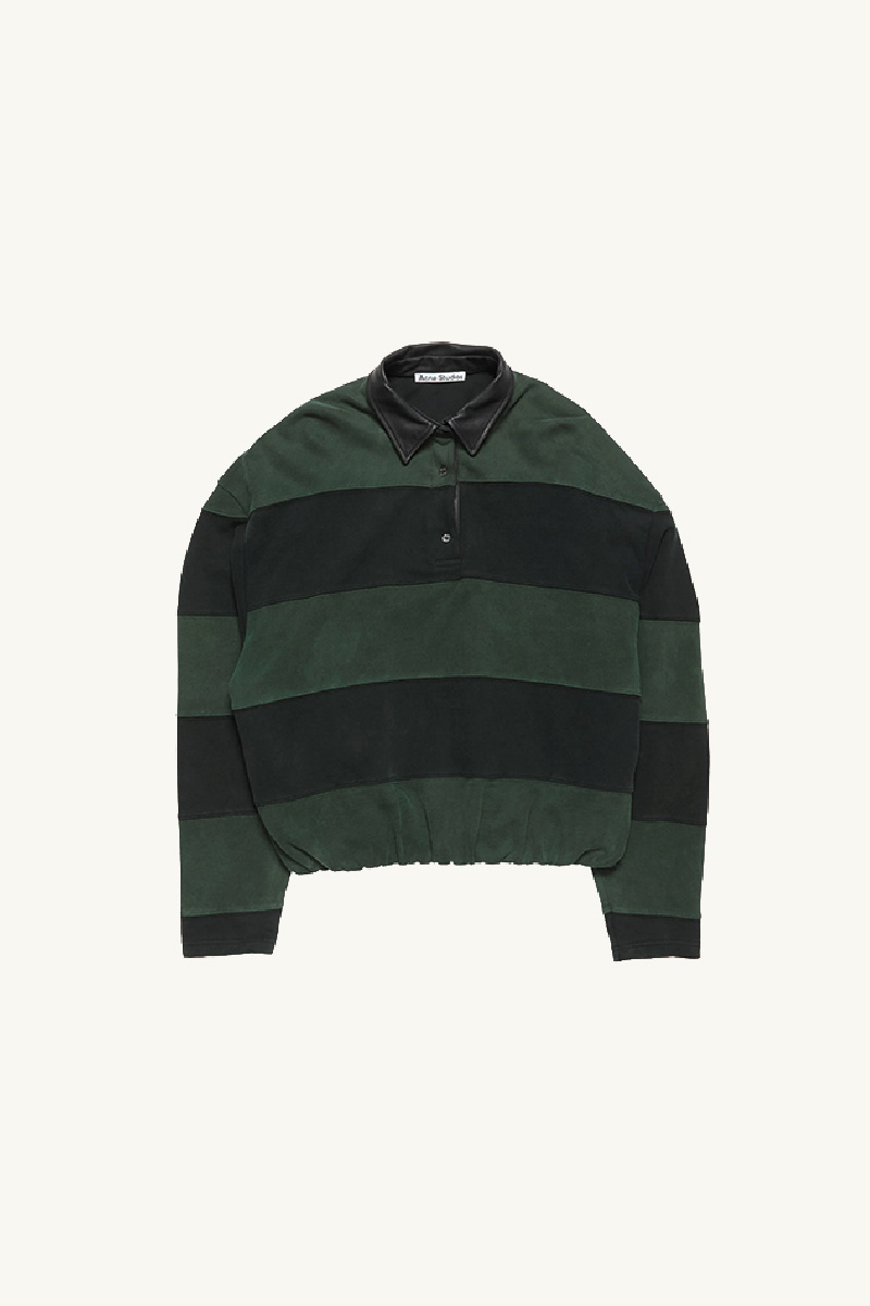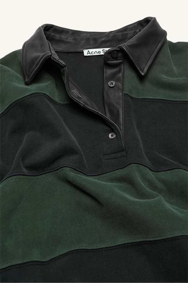 Polo neck sweatshirt made from forest green and vintage black organic cotton fleece and black leather, by Acne Studios.