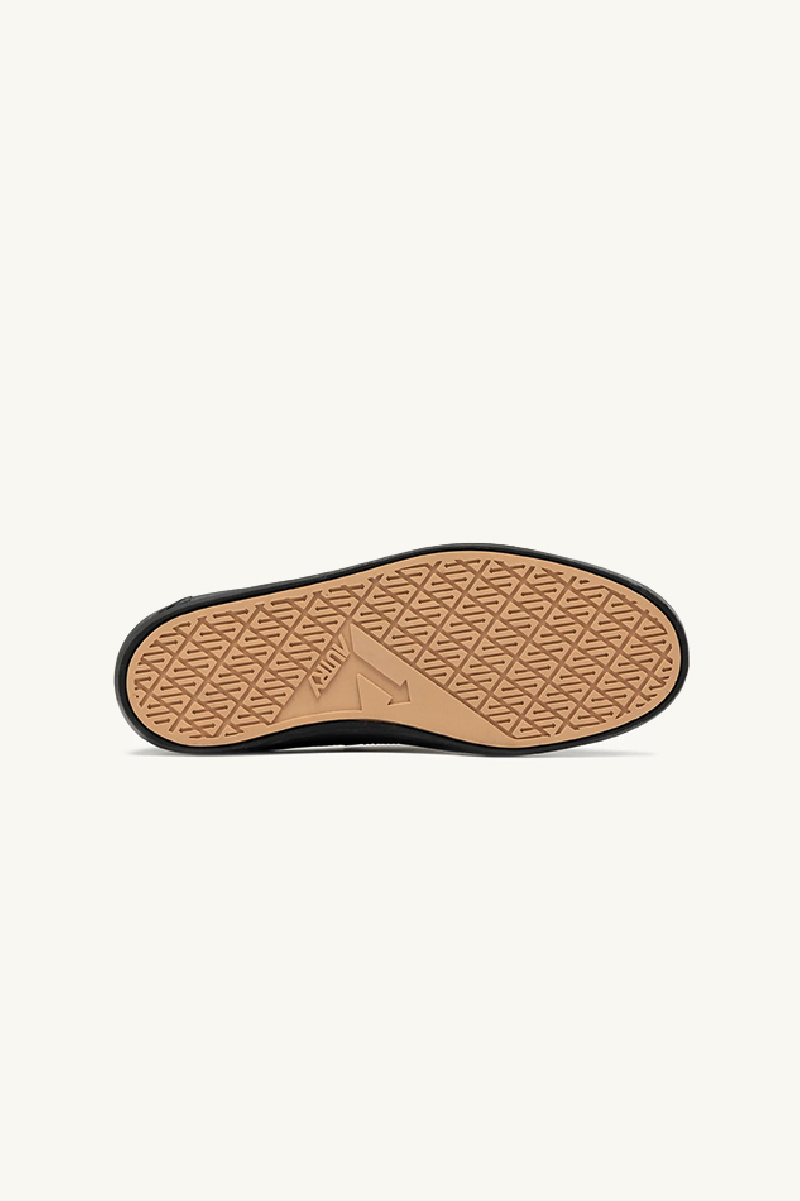 Inspired by surf culture, they feature an all-black minimalist shape with a worn effect, forefoot patch, a tongue with a scribbled label, flat black cotton laces, a scribbled black heel and a black rubber sole.