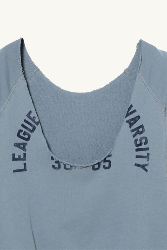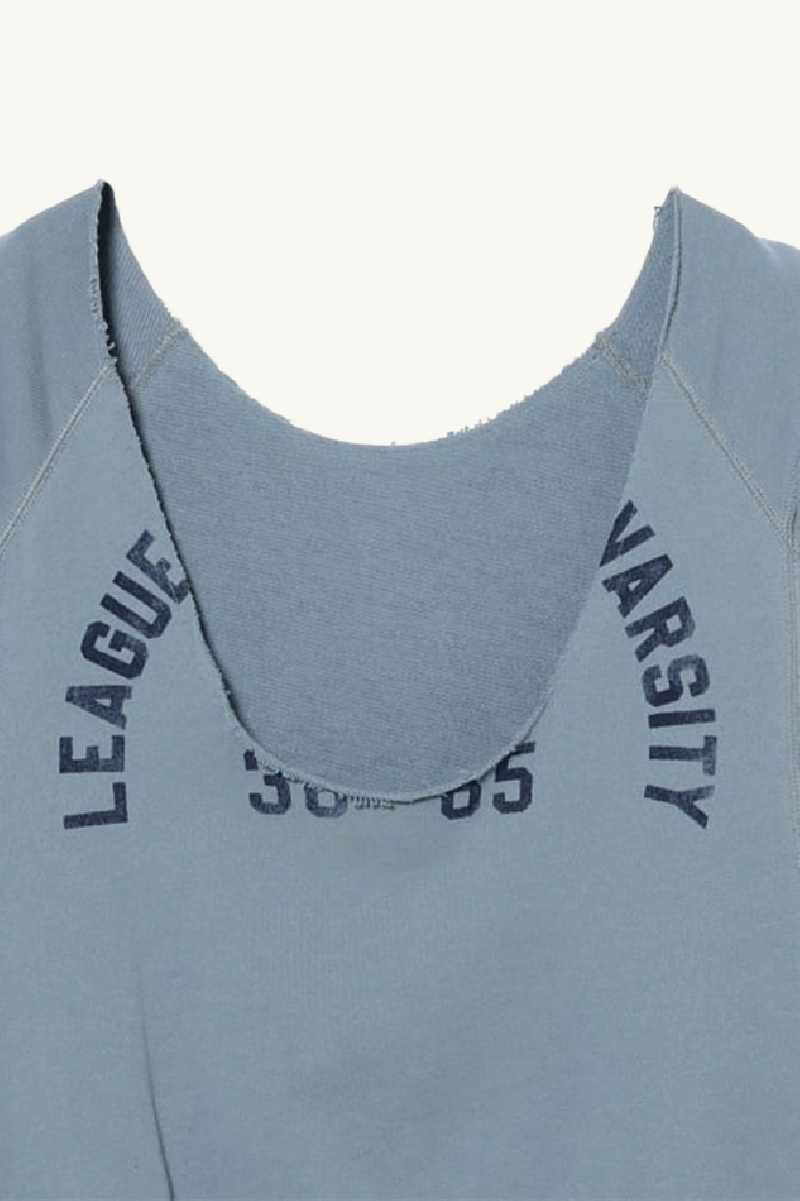 Inspired by vintage tracksuits, it revisits their codes: open-chest College pattern forming a deep neckline, revisited raglan sleeves in wide armholes, and raw edge finishes for a mastered raw effect.