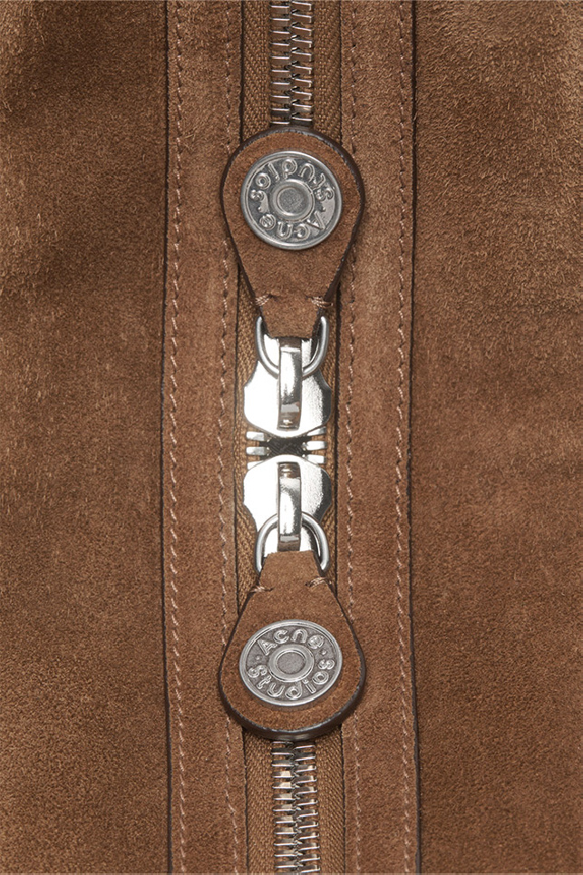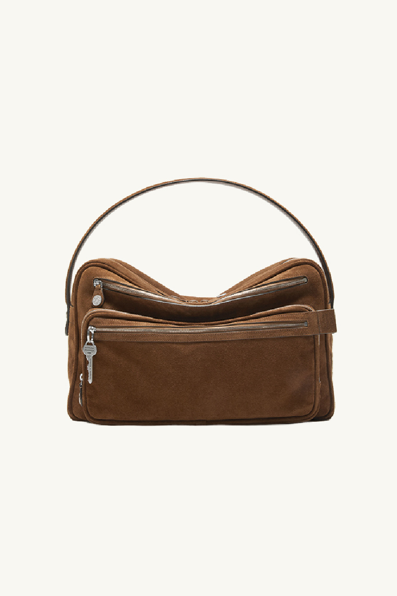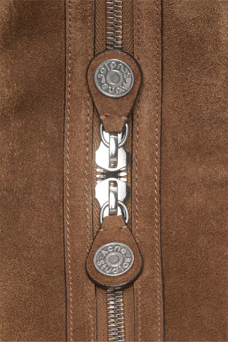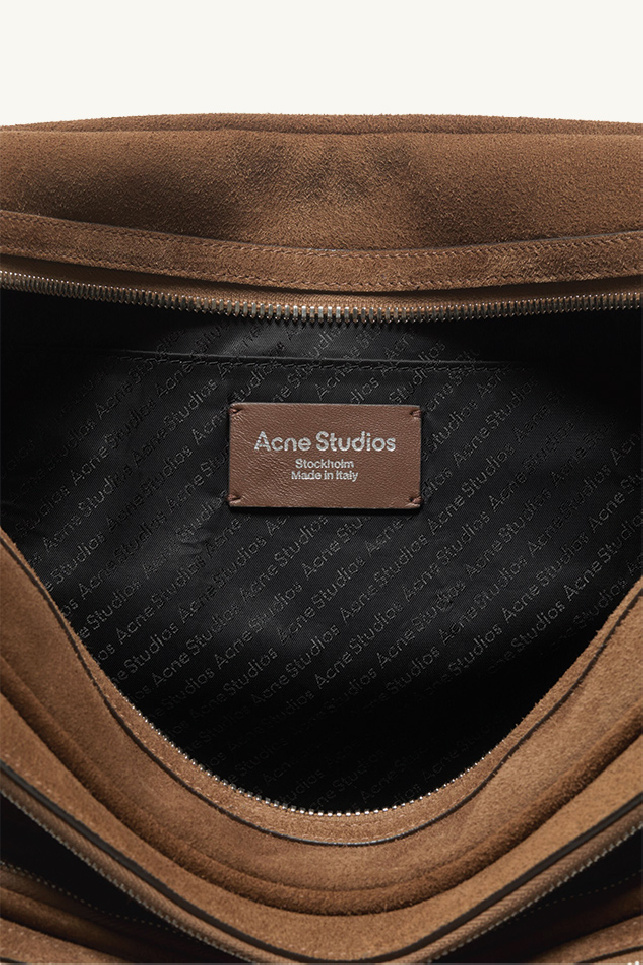 Large multipocket bag in cognac brown suede from the brand Acne Studios.