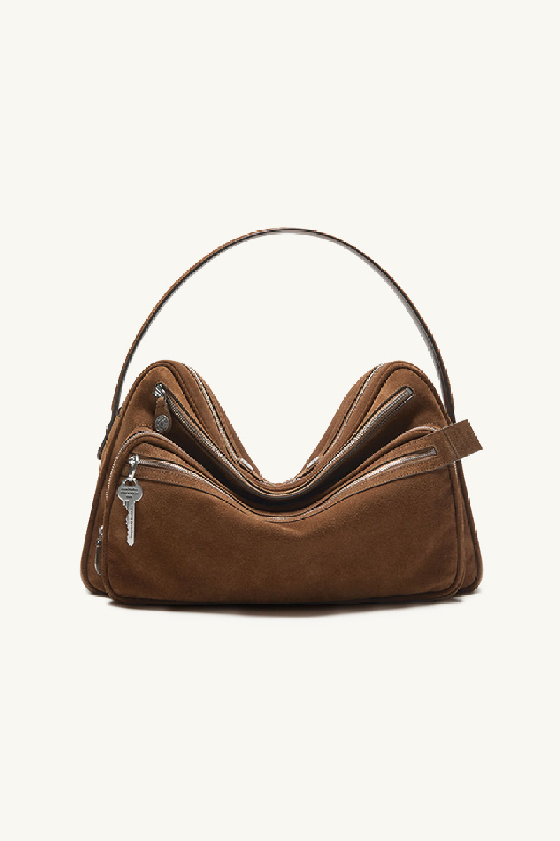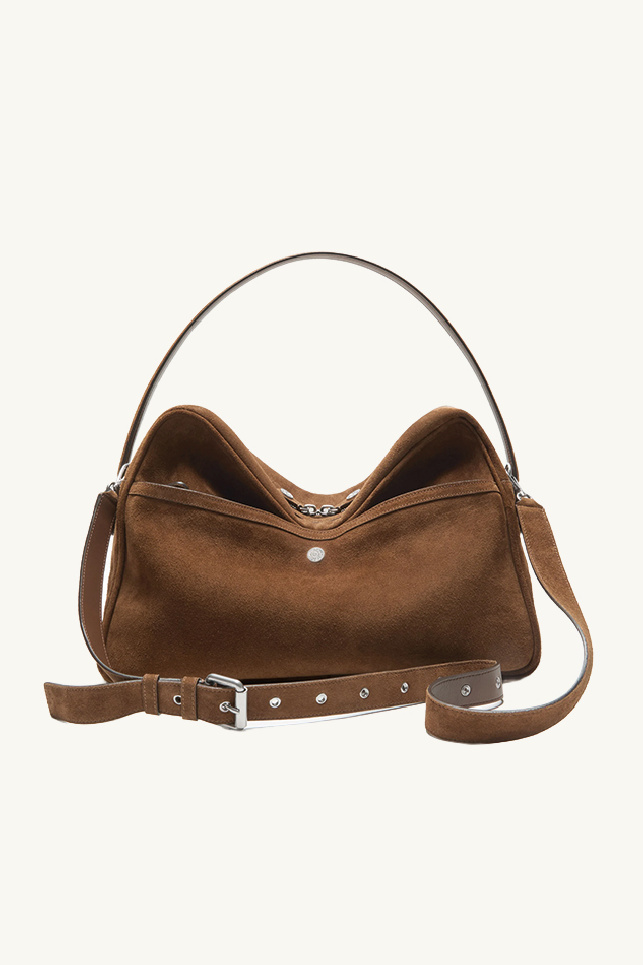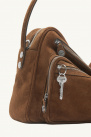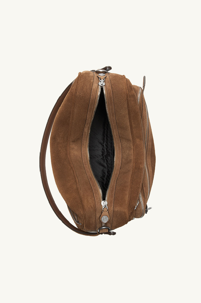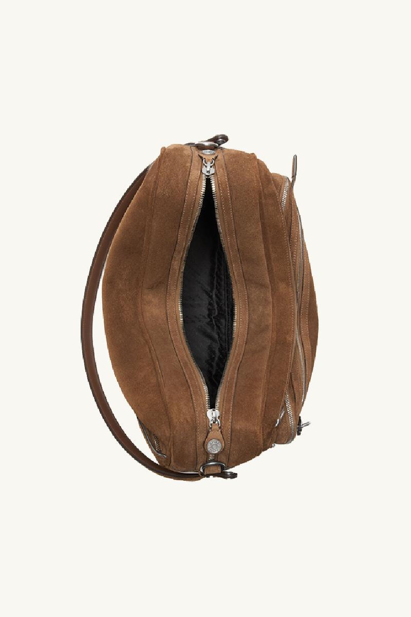 Large multipocket bag in cognac brown suede from the brand Acne Studios.