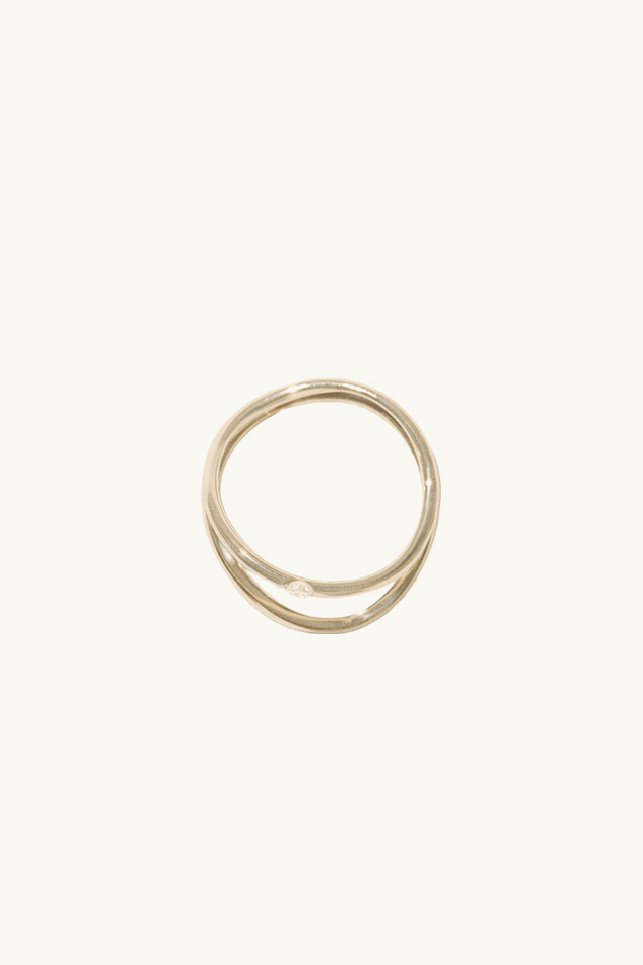 Set with a diamond, its design of two fine interwoven bands, with delicate undulations, evokes the soft, flowing curves of sand dunes.