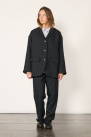 This piece stands out for its oversized fit, dropped shoulders, notched lapel collar, and flap pockets.
