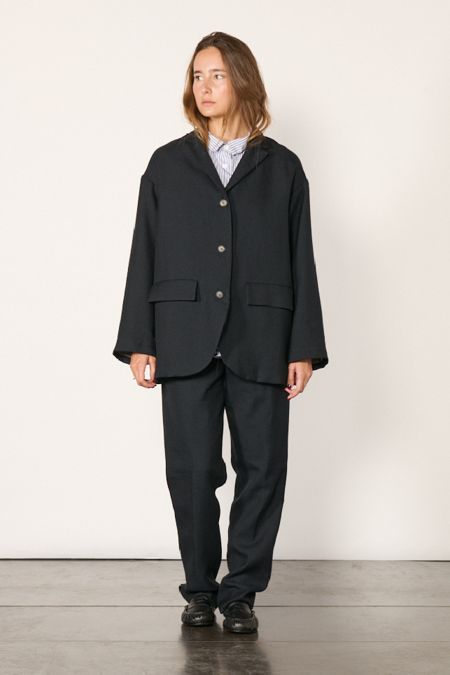 Jacket crafted from a black wool and linen blend by Bergfabel.