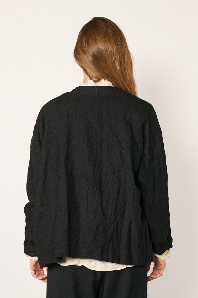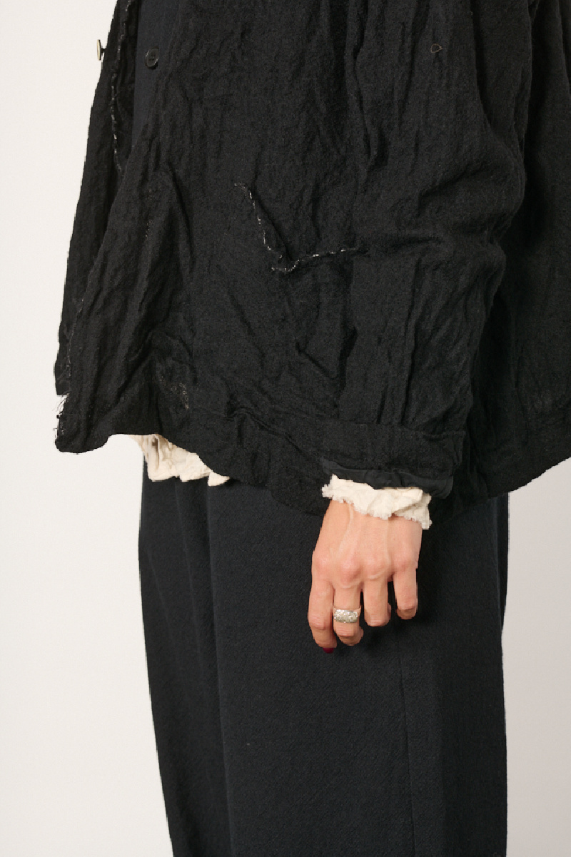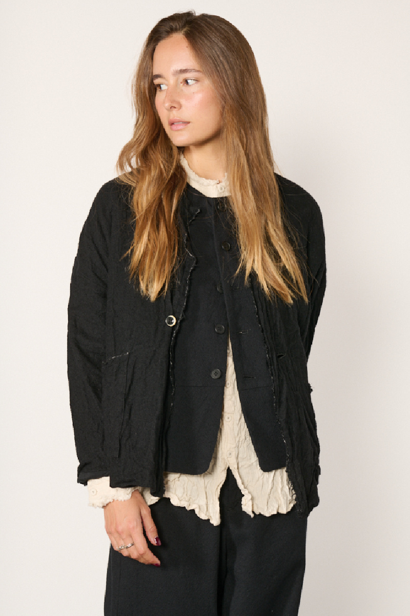 Collarless jacket made from refined black wool gauze, fully lined, by Pas de Calais.