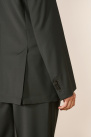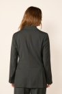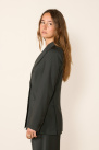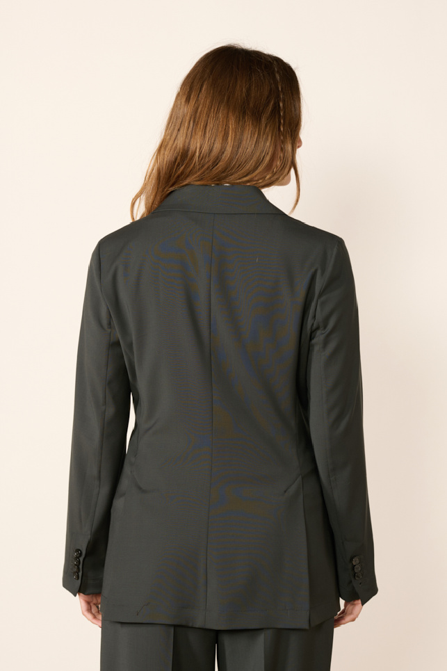 It offers a slim and refined cut, with a crossed silhouette, a pointed lapel collar, and patch pockets.