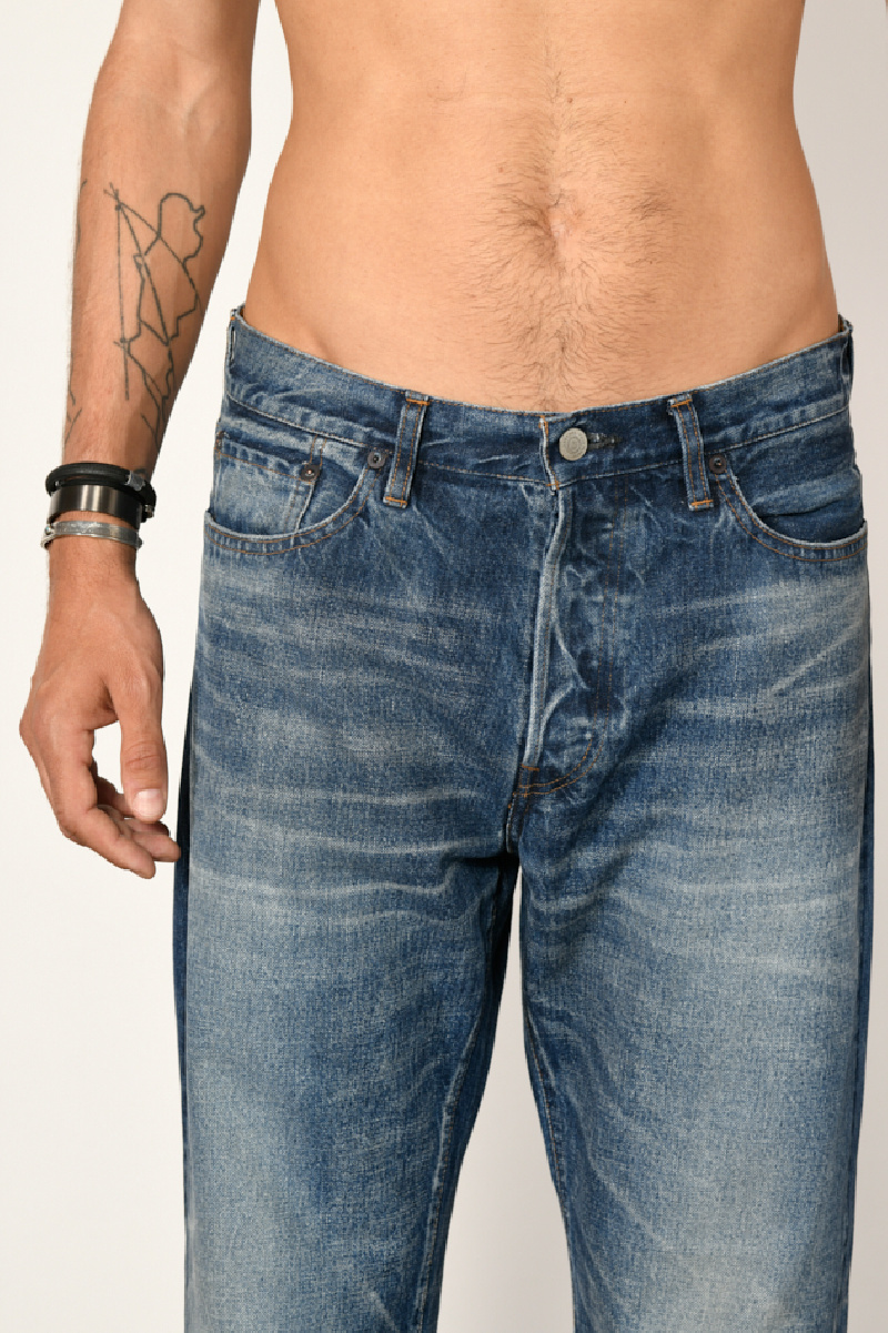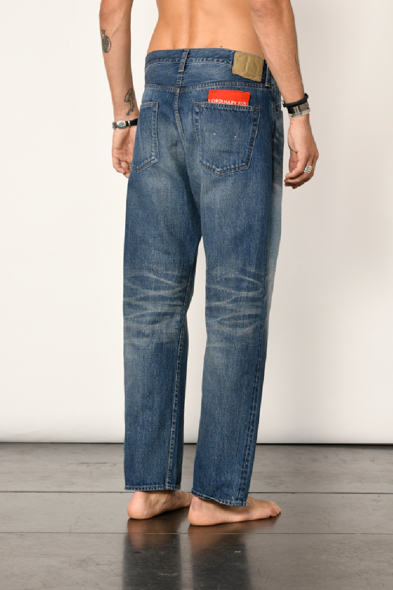 Ordinary Fits jeans in worn blue, with a mid-rise waist and front button fastening. The fit is slightly loose and relaxed, with straight hems. A leather label at the back is accompanied by a red bandana emblazoned with ‘Ordinary Fits’ in white.