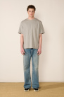 It features a straight fit with a mid-rise waist and a subtly flared leg from the knee, finished with a button fly and classic five-pocket construction.