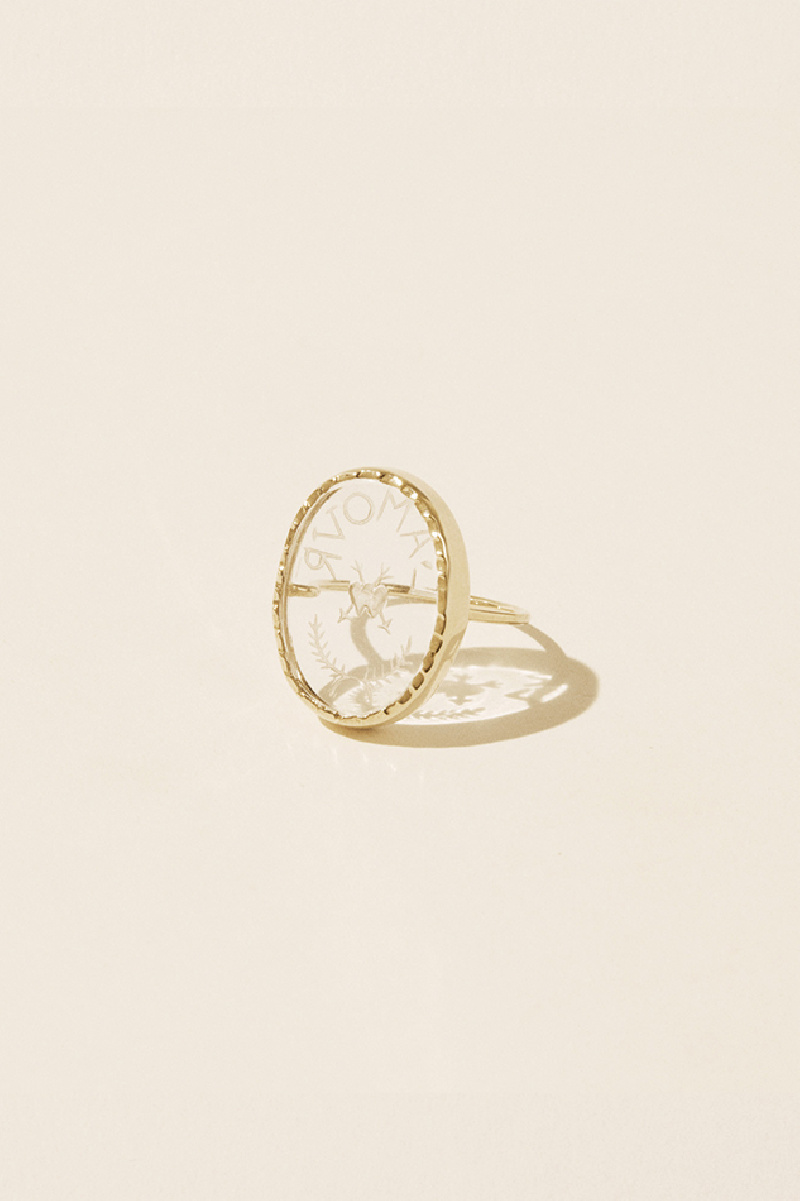 9 carats yellow gold ring with rock crystal from the brand Pascal Monvoisin. Hand engraving.