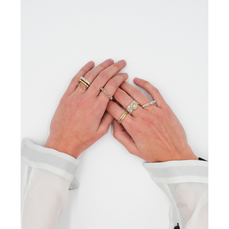 Rosa Maria ring in silver set with an icy yellow diamond. Rosa Maria jewelry is a bold blend of ethnic inspiration and raw industrial spirit.