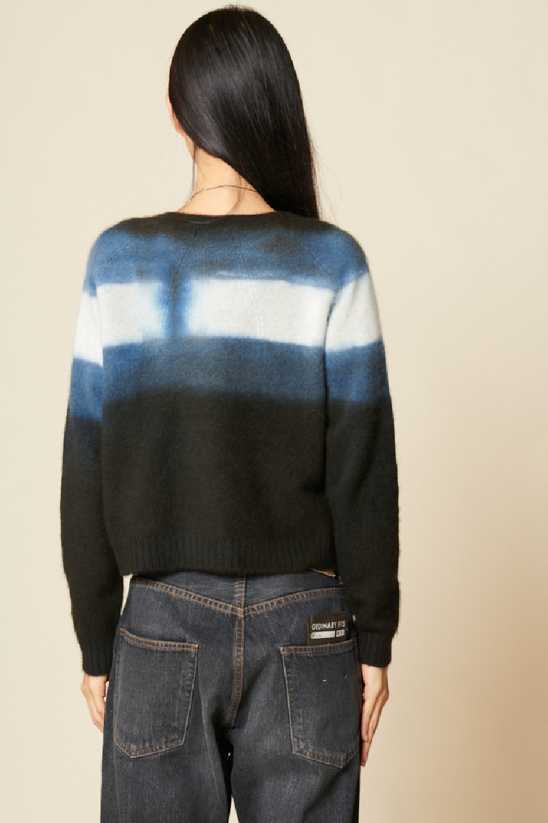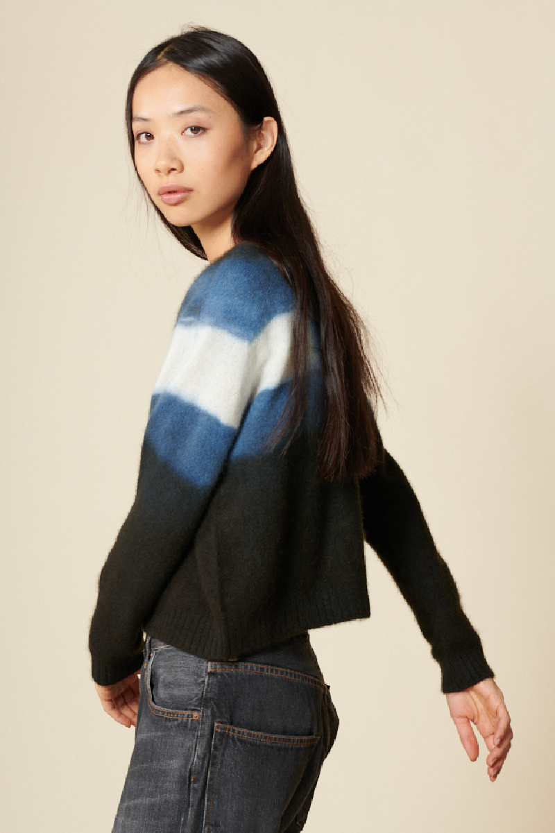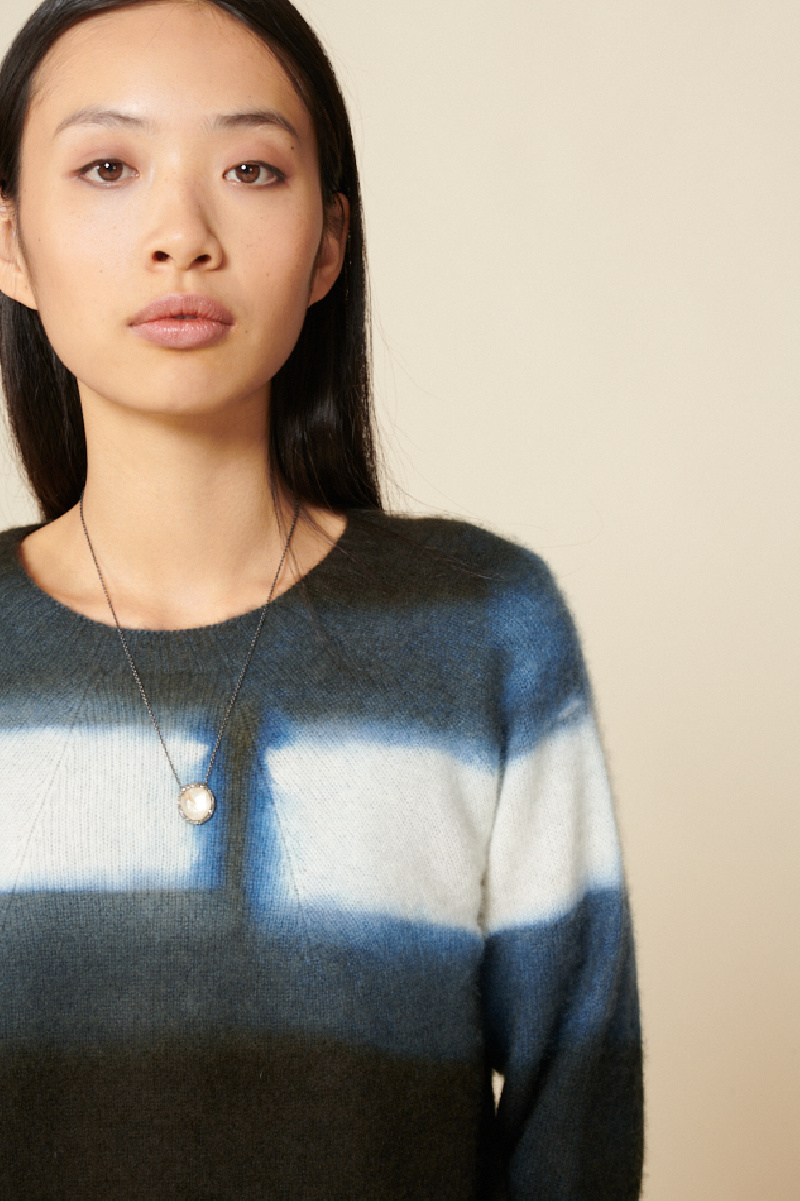 Suzusan jumper in soft cashmere, presented in a gradient of black, natural and blue. This model features long sleeves, a classic round neck and raglan armholes for extra comfort and a stylish fit.