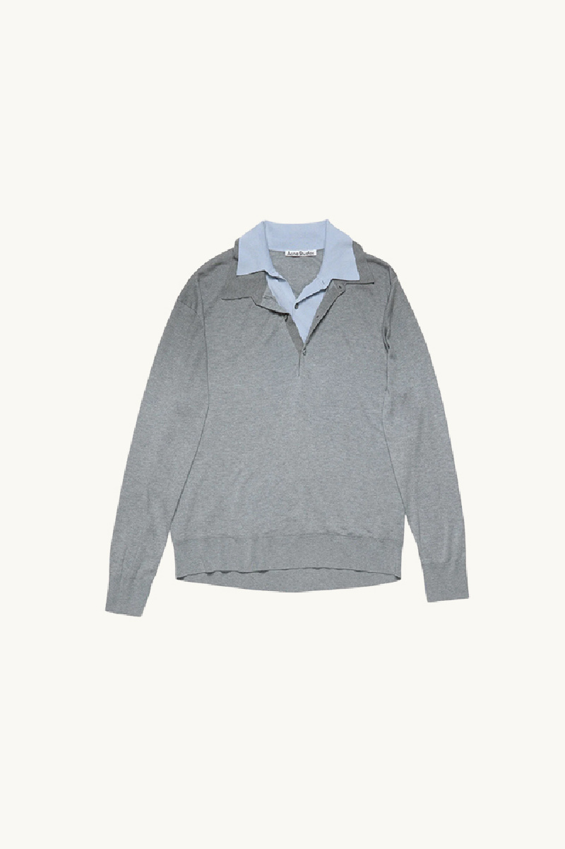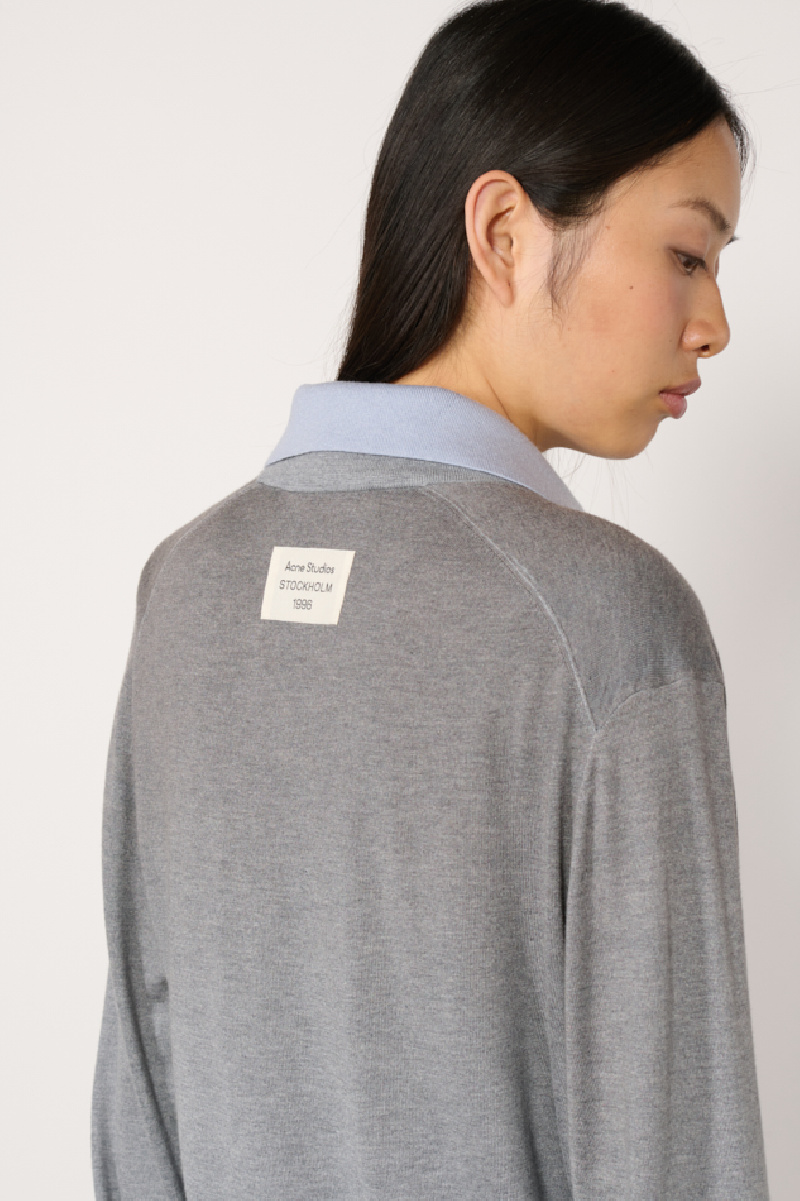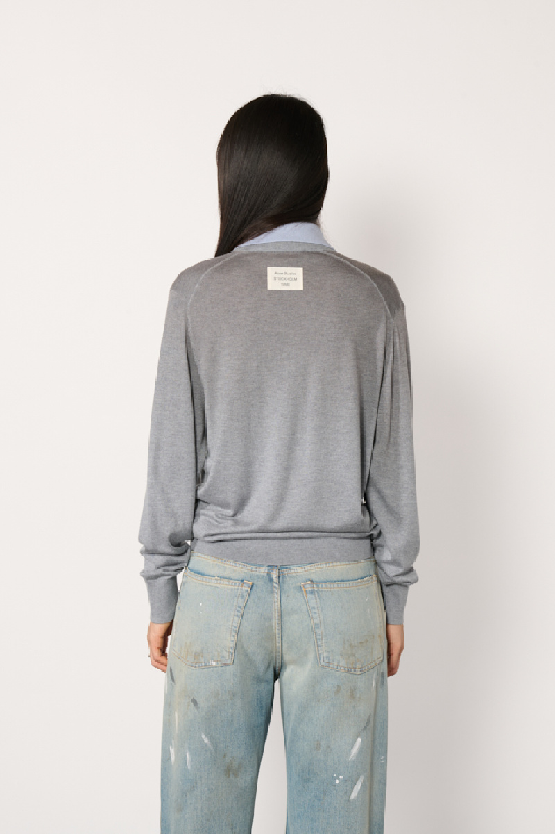 Grey sweater made of silk, cashmere and wool, and layered over a blue cotton shirt collar, from Acne Studios.