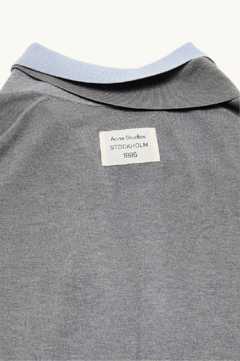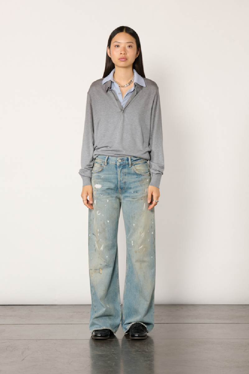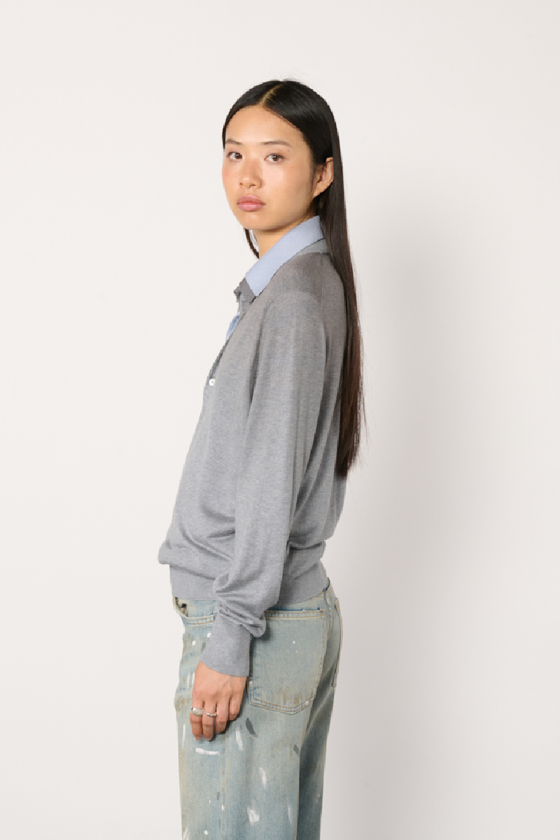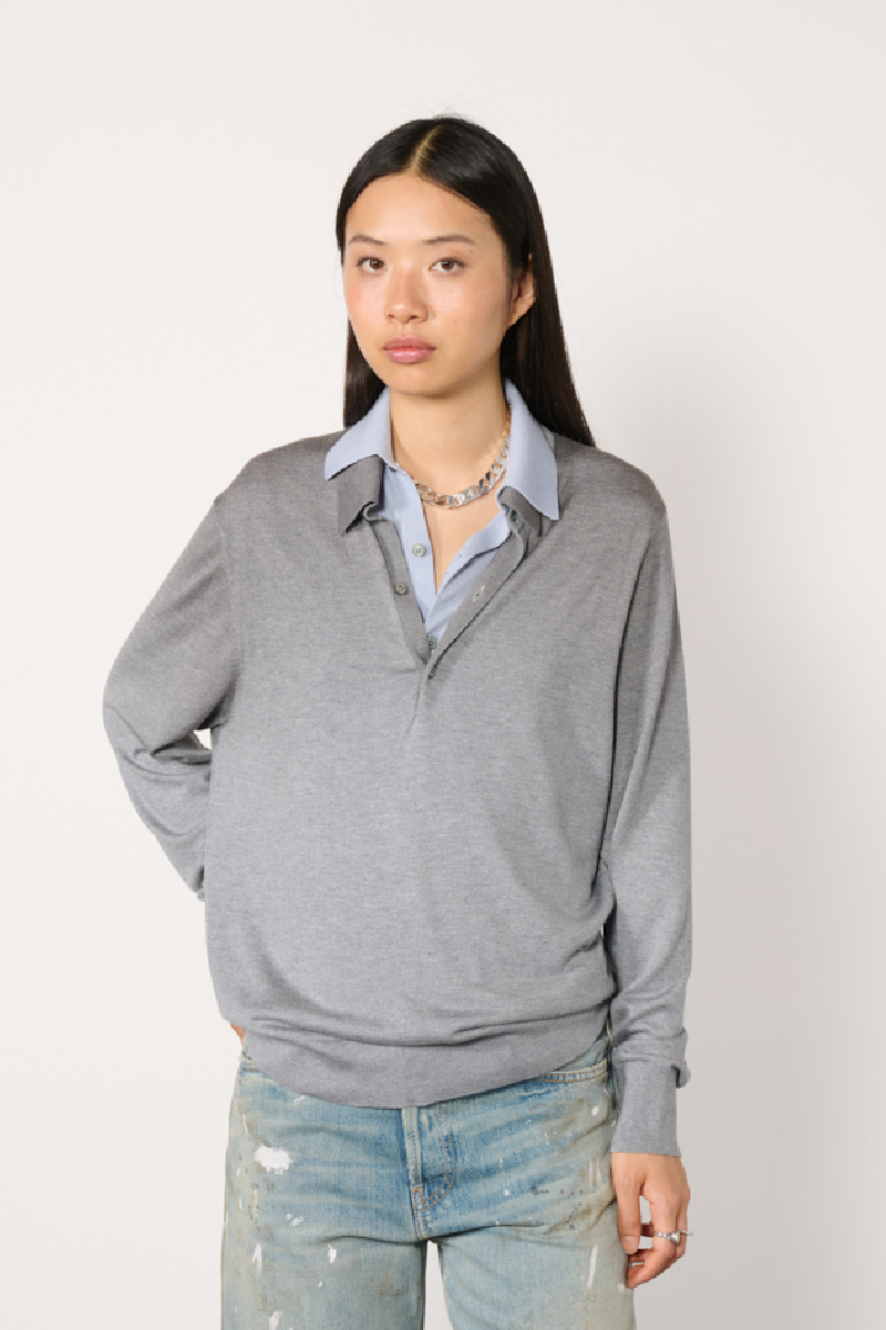 Grey sweater made of silk, cashmere and wool, and layered over a blue cotton shirt collar, from Acne Studios.