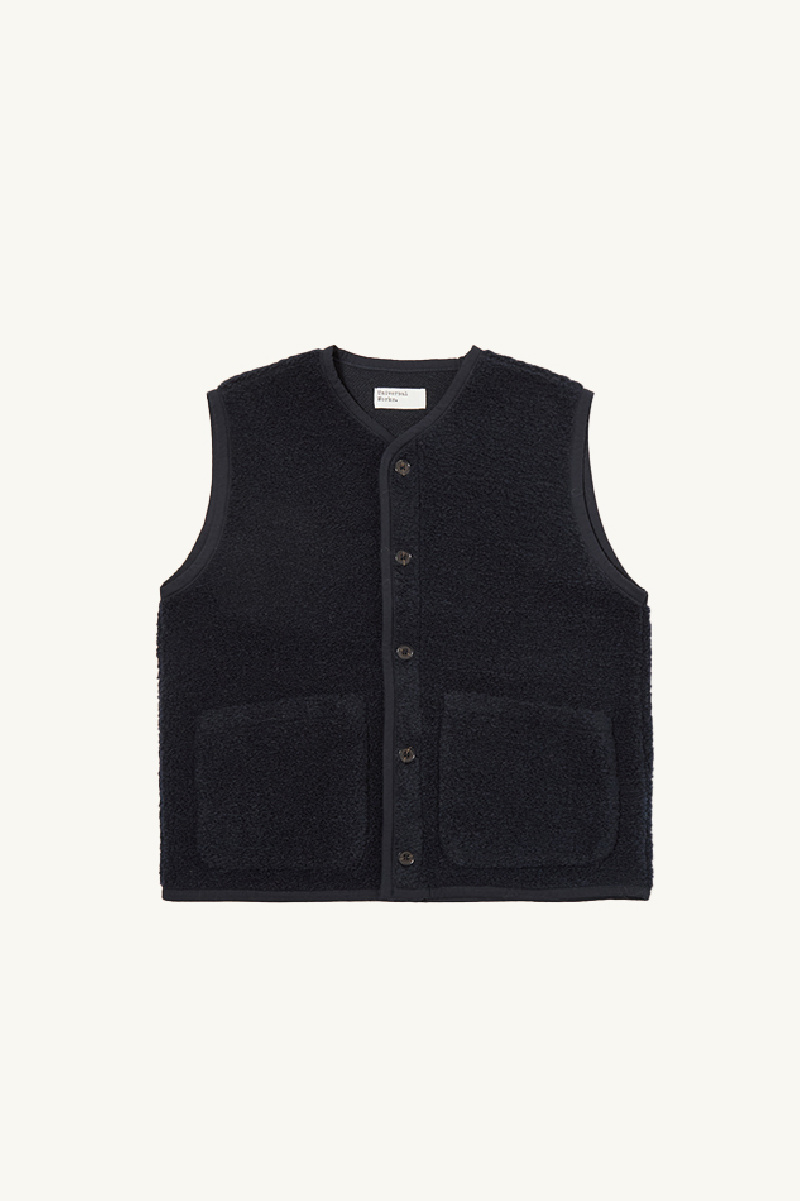 Alvar navy fleece sleeveless cardigan from Universal Works.