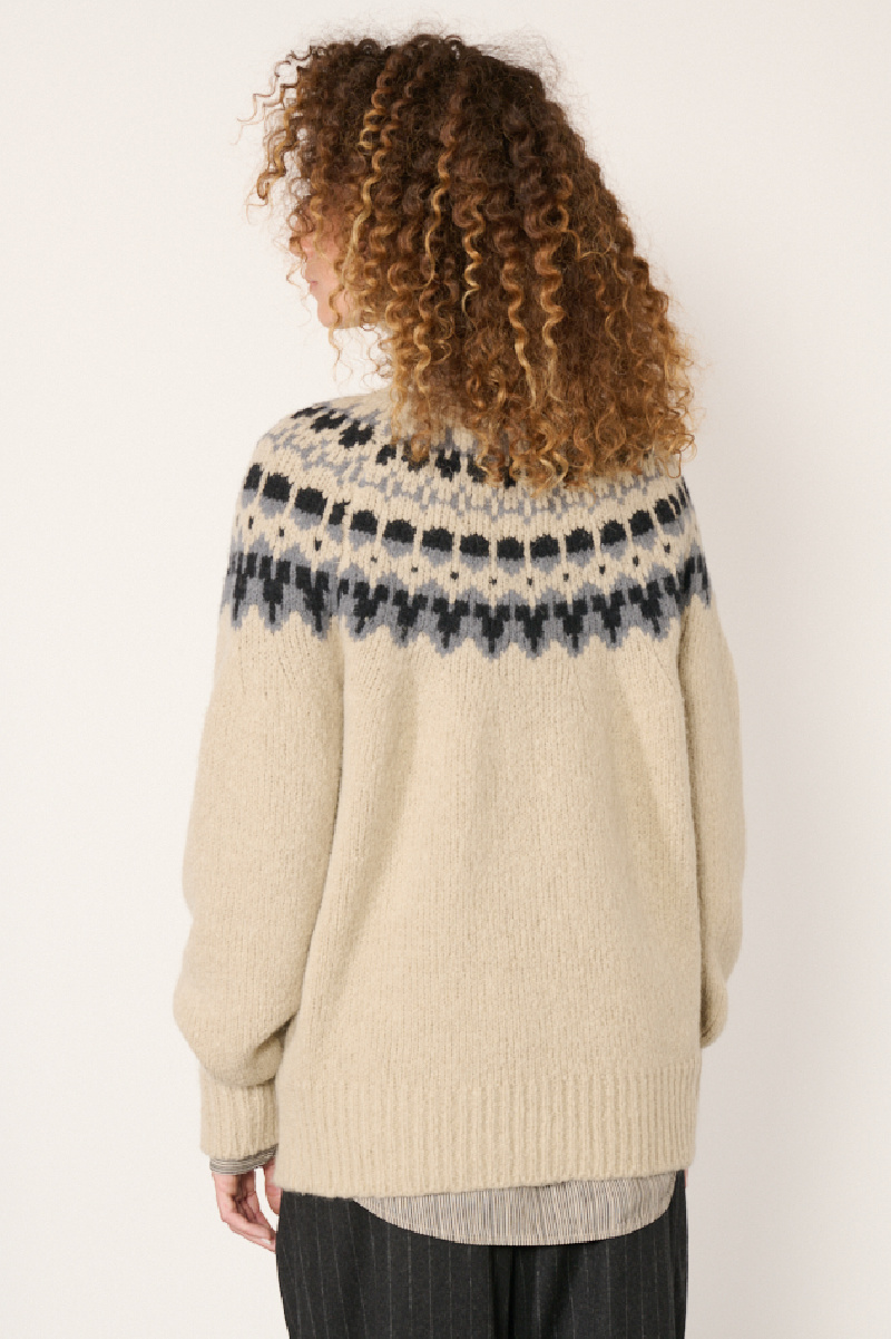 It features a relaxed fit with a high collar and long raglan sleeves for added comfort and a modern look. The piece stands out thanks to its refined Norwegian-inspired pattern.