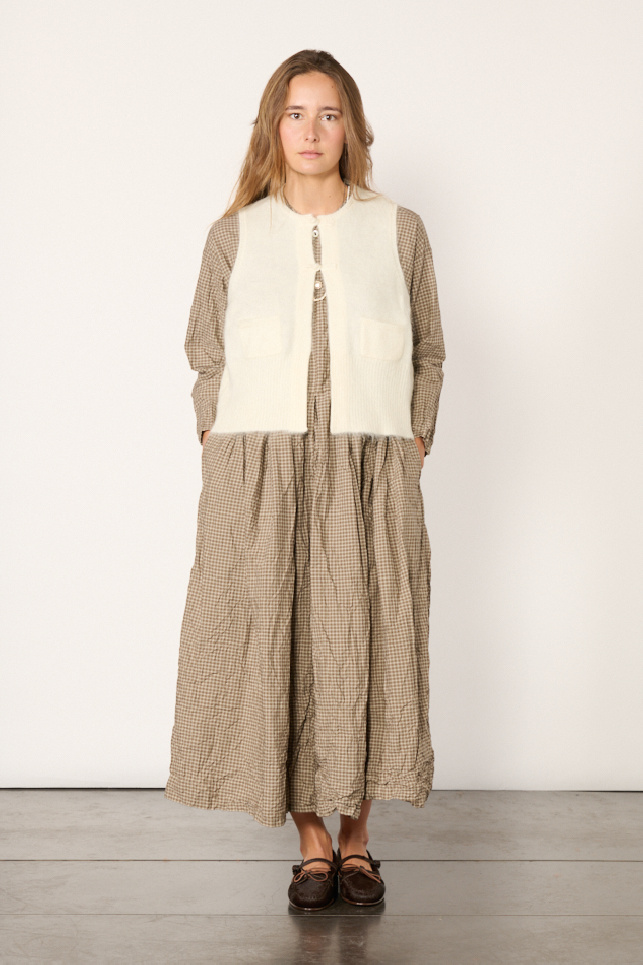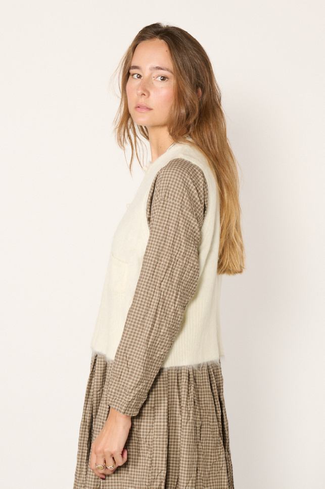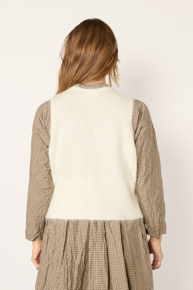 Knit vest crafted from an off-white wool and nylon blend by the brand Beams Boy.