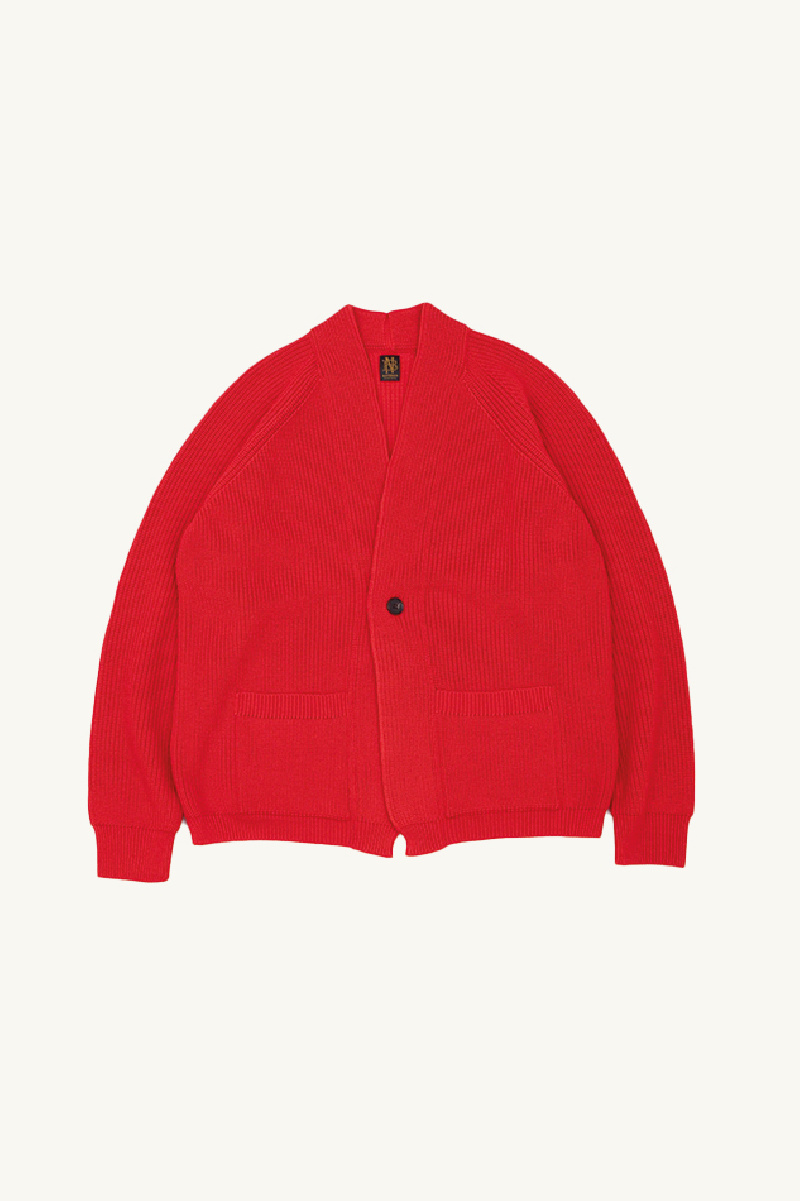 The single-button cardigan by Batoner is made from red premium wool knit, the brand’s signature, known for its dense, soft and durable texture.