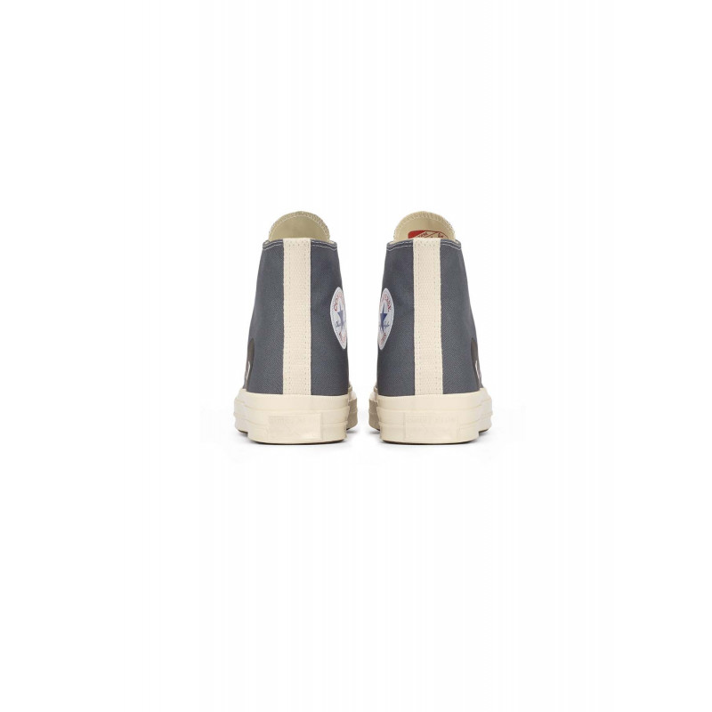 Converse Chuck Taylor x CDG grey high shoes, red logo patch heart pattern on the side, two inner side eyelets, round toe, lace-up closure, rubber sole.