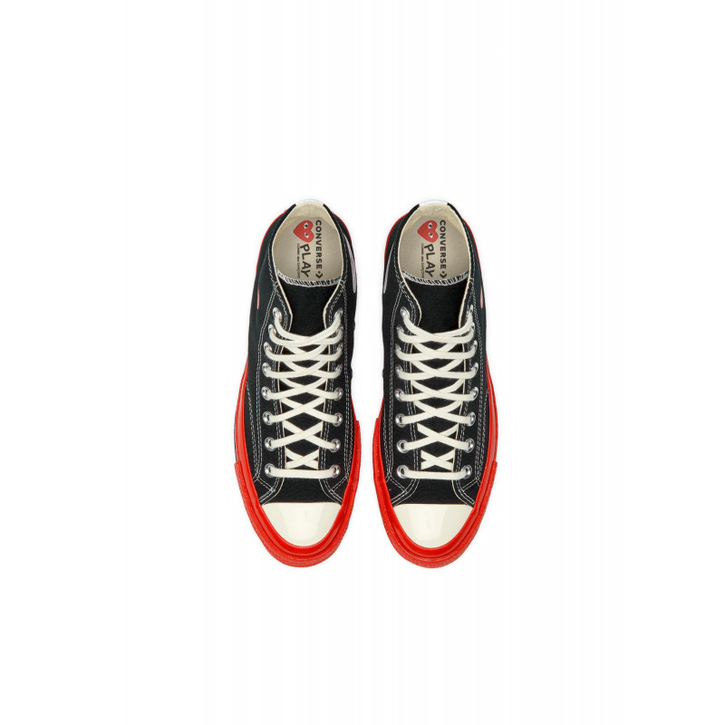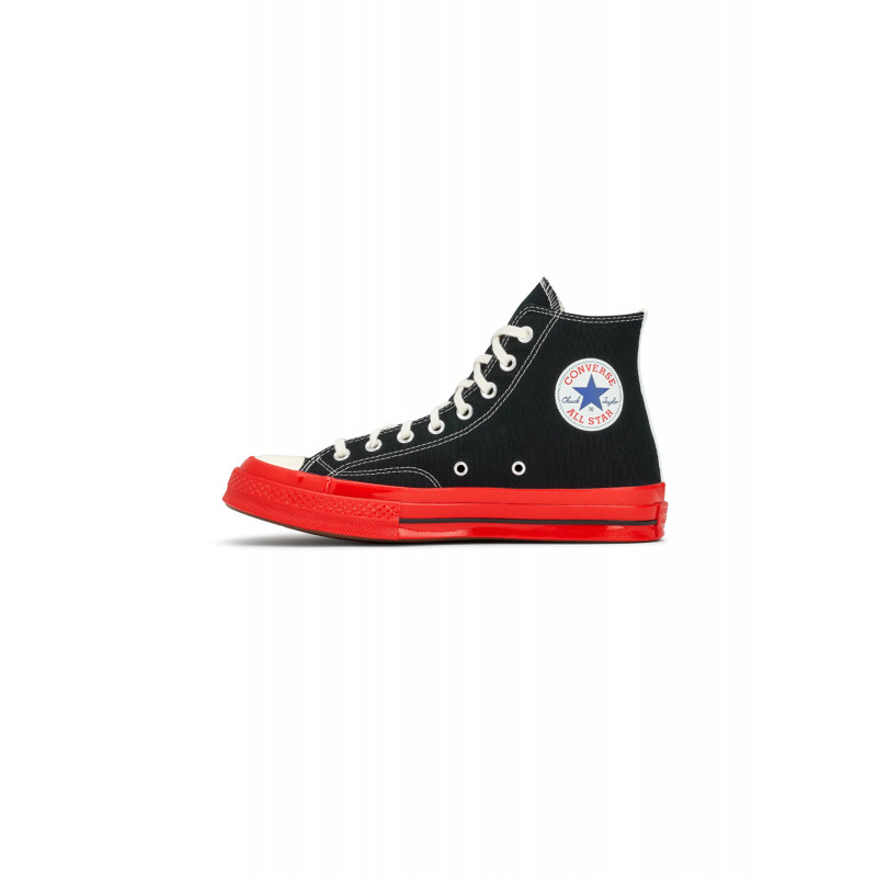 Converse Chuck Taylor x CDG black high shoes, red logo patch heart pattern on the side, two inner side eyelets, round toe, lace-up closure, red rubber sole.