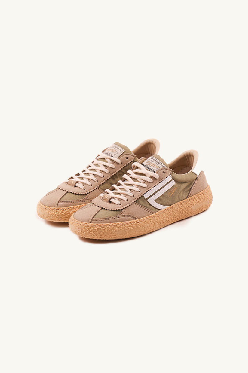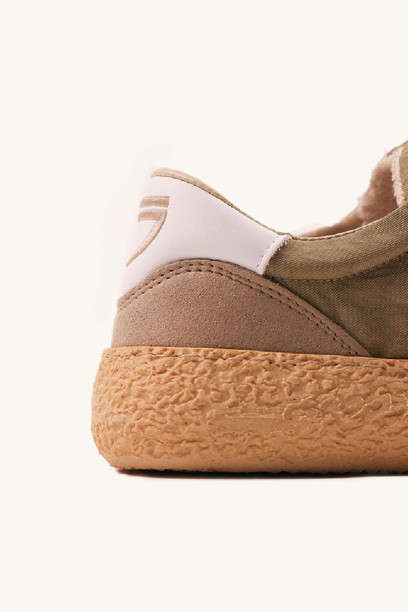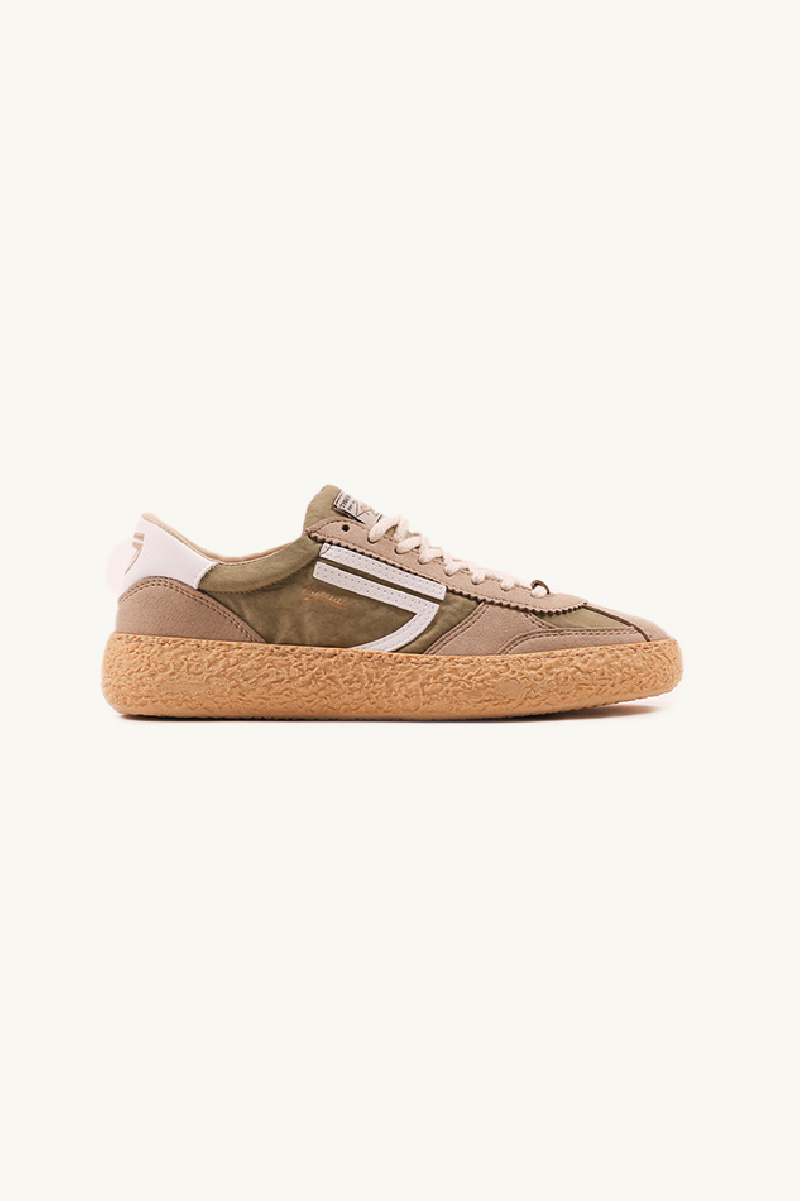 Basket 1.01 Golden Beach by the brand Puraai, in taupe suede and sage green nylon, eco-responsible and recycled.