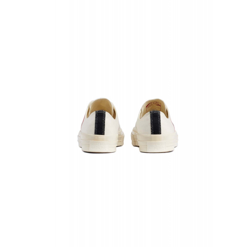 Converse Chuck Taylor x CDG white low shoes, red logo patch heart pattern on the side, two inner side eyelets, round toe, lace-up closure, rubber sole.