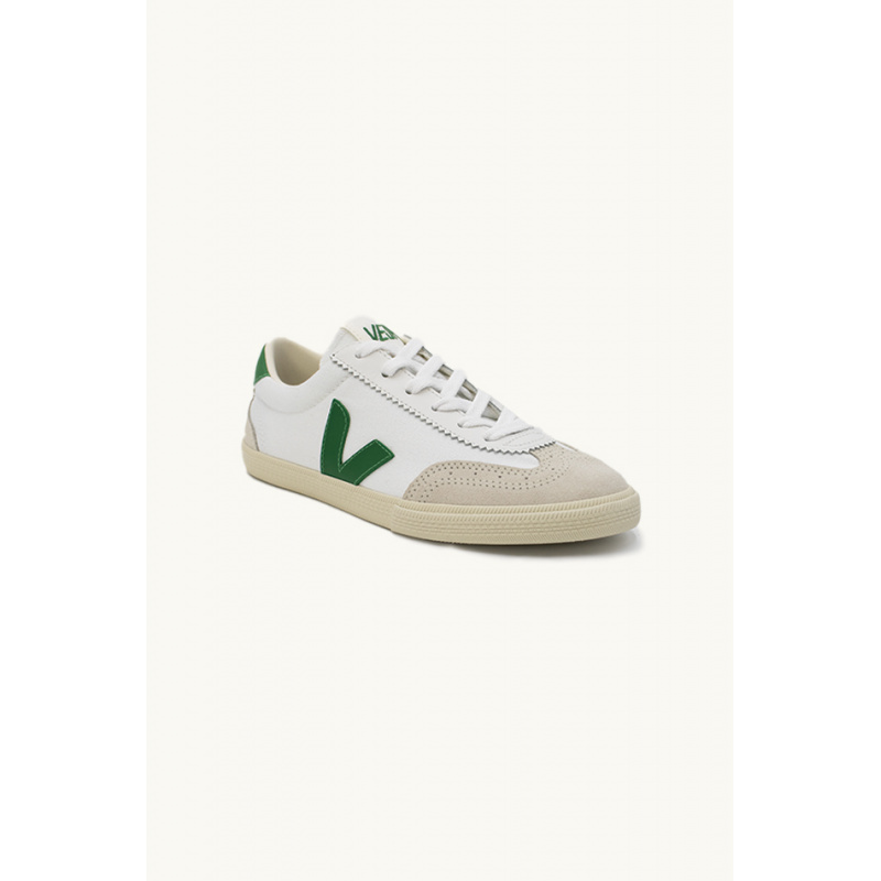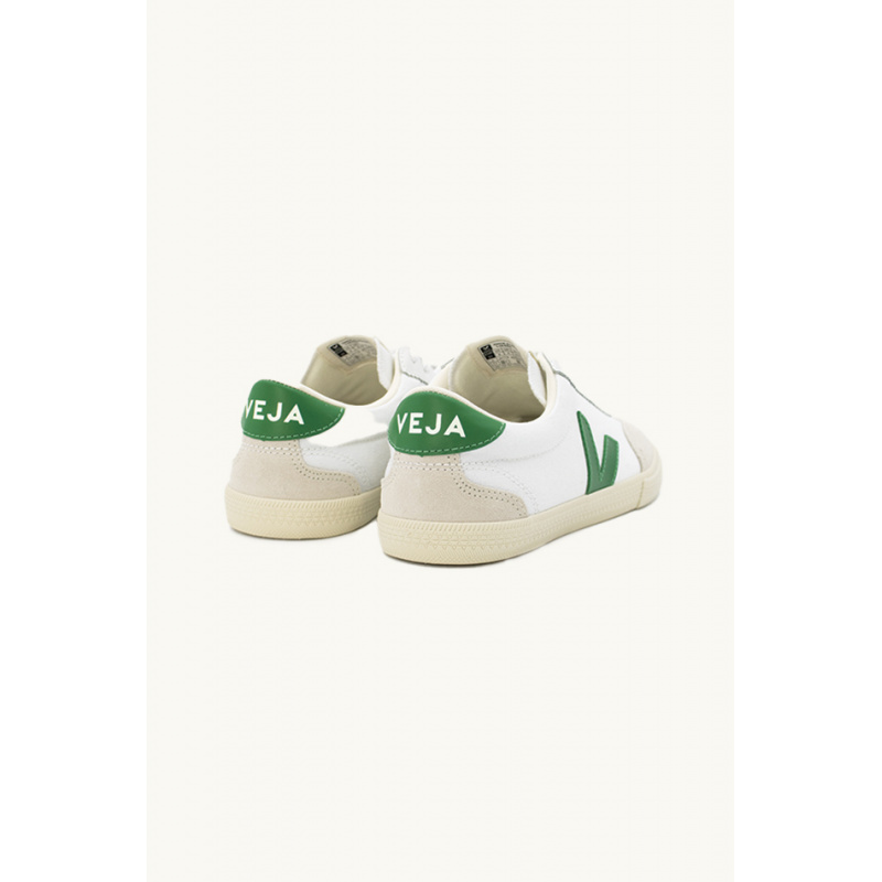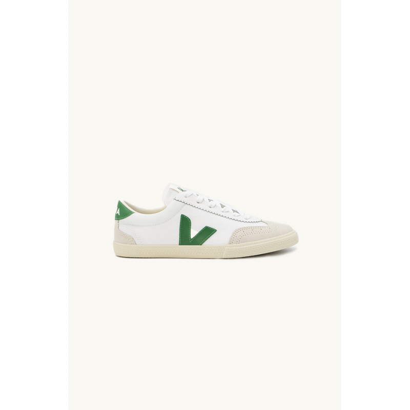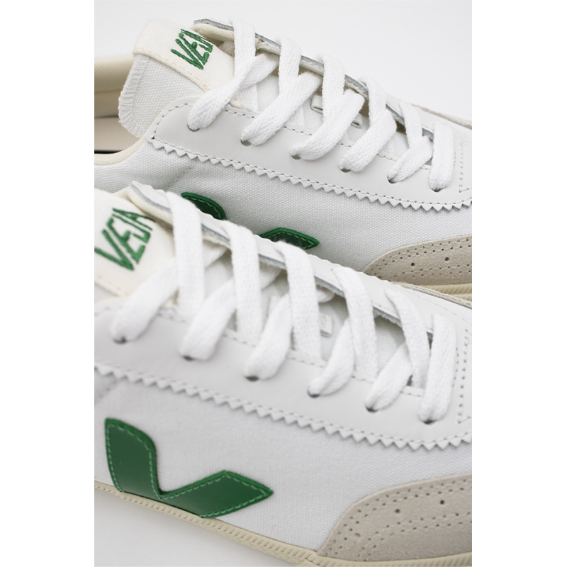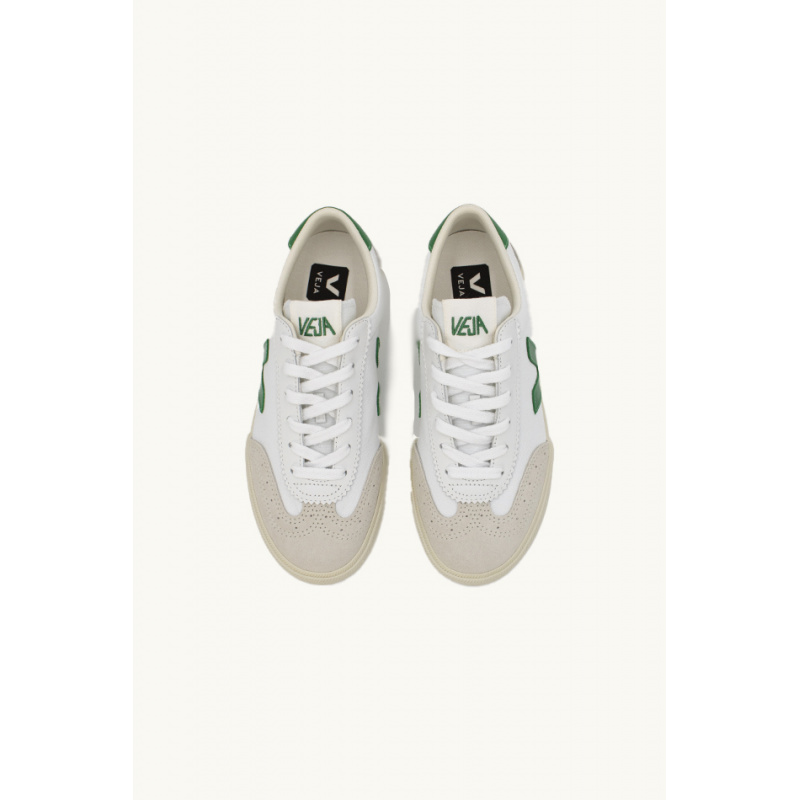 Veja sneakers, white and green, in smooth leather, rounded toe, black logo applied on the side, heel and padded black ankle reinforcement, laces, outsole in wild rubber from the Amazon, lining in organic cotton.