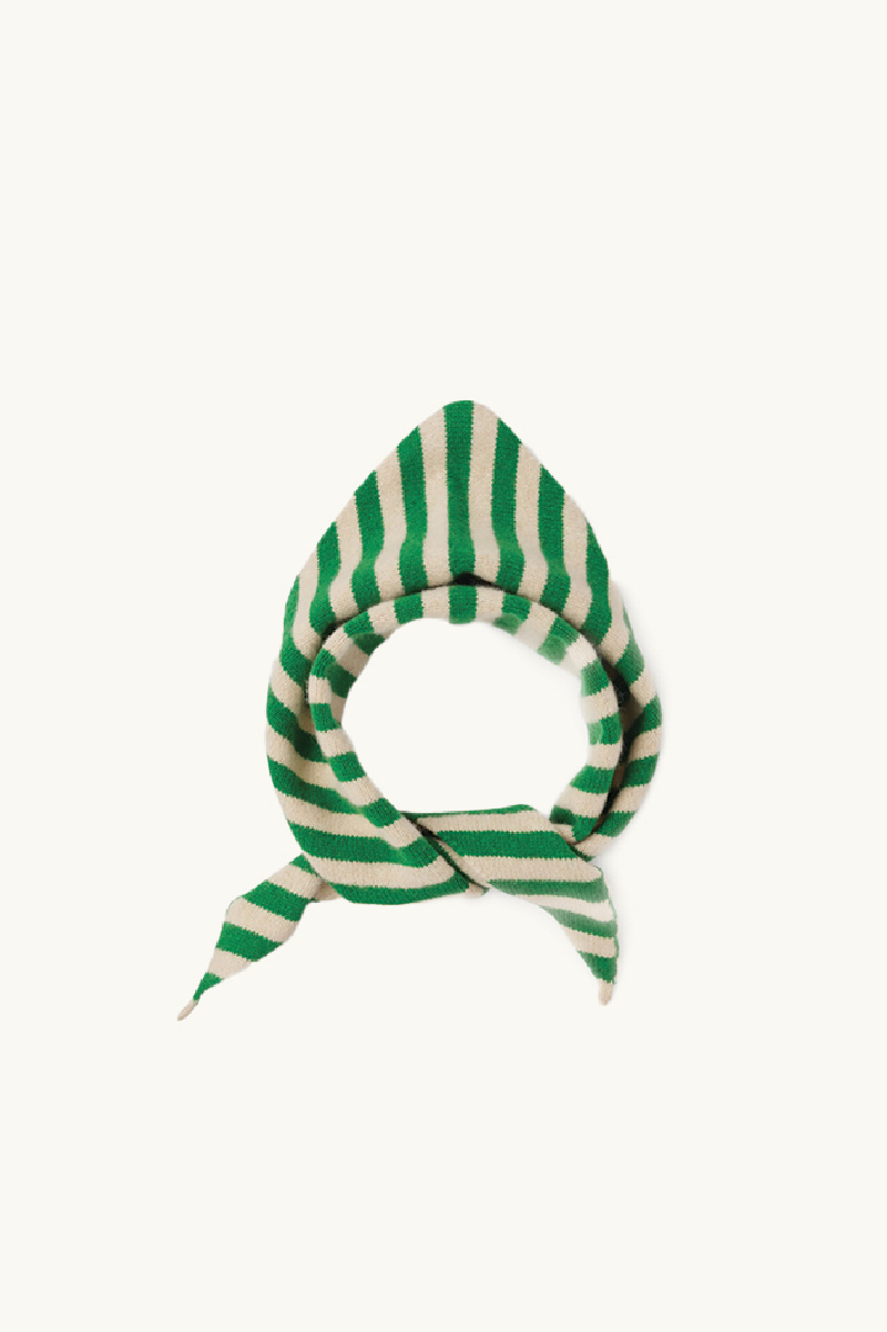 This knitted scarf, in green and beige, offers several ways to wear it: tied at the front, at the back or simply as a scarf. Compact enough to slip easily into your bag in case of cold weather.