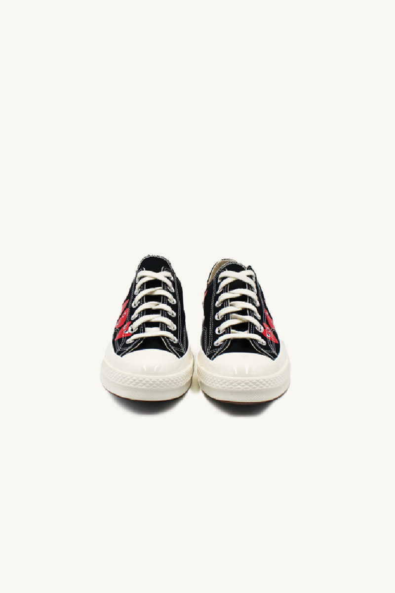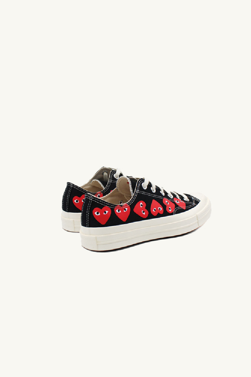 Black multi herart Chuck 70 X CDG play low-top trainers with red logos, reinforced round rubber toe, white lacing, red, white and black logo image printed on sides, off-white rubber sole with logo at heel, silver-tone hardware. Designed as part of the Comme des Garçons Play X Converse collaboration.