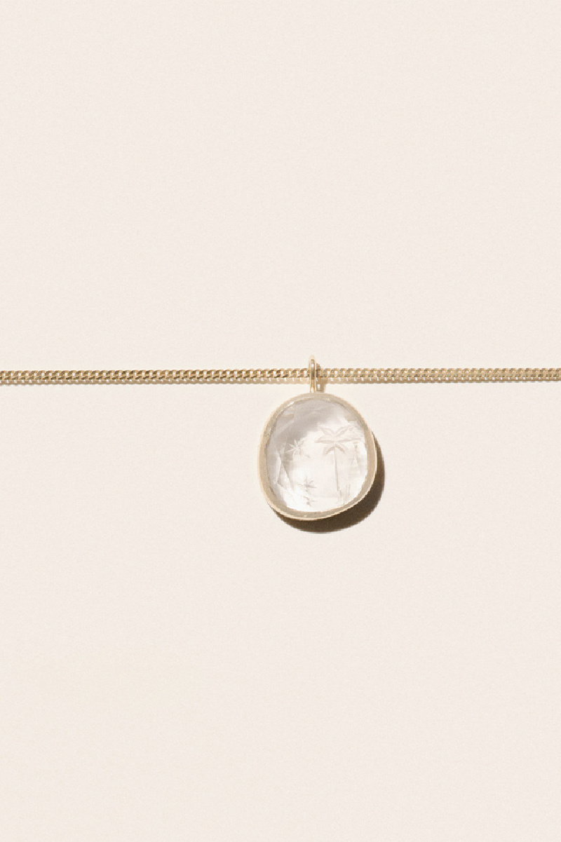 Alba necklace, mounted on an adjustable gold chain (54 cm, reducible to 50 cm), the rock crystal medallion (1.7 x 1.5 cm) is adorned with a hand-engraved palm tree and Emily Dickinson's quote ‘Forever is composed of nows’, an ode to the present moment.