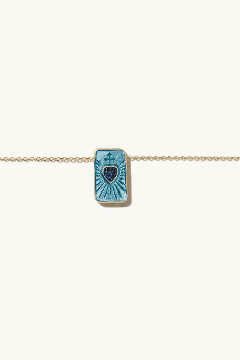 Inspired by talismans, this piece reveals a delicate gold rectangular pendant adorned with blue resin, at the center of which lies a heart-shaped London blue topaz stone, finely surrounded by engraved details. The reverse, fully gilded, is pierced with a heart revealing the stone beneath.