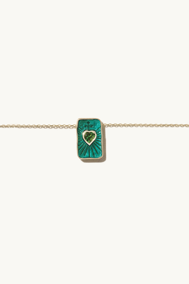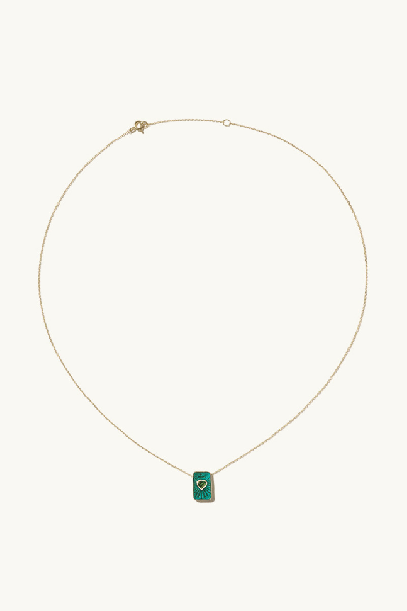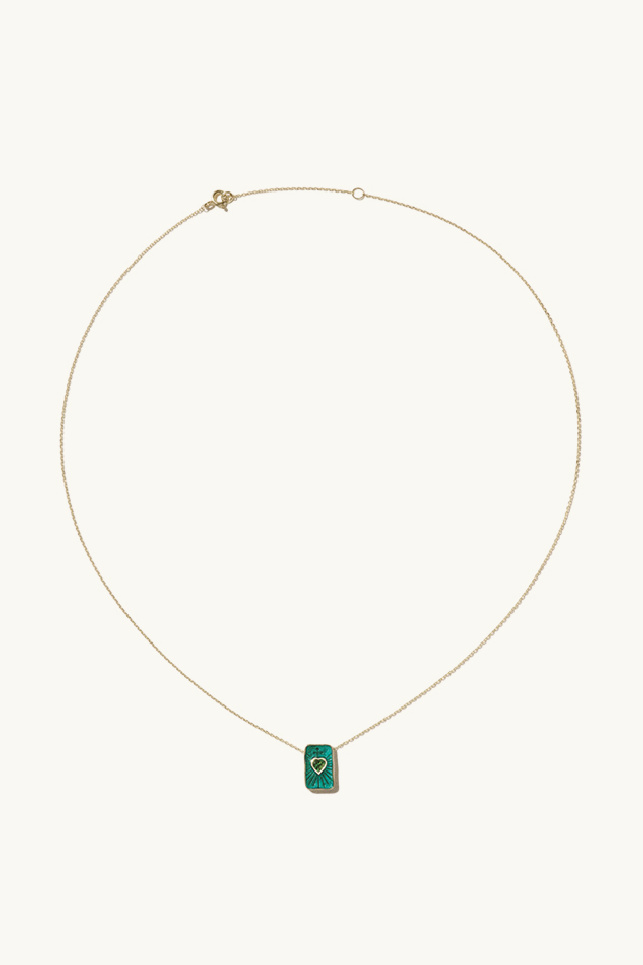Inspired by talismans, this piece reveals a delicate gold rectangular pendant adorned with green resin, at the center of which lies a heart-shaped green stone, finely surrounded by engraved details. The reverse, fully gilded, is pierced with a heart revealing the stone beneath.
