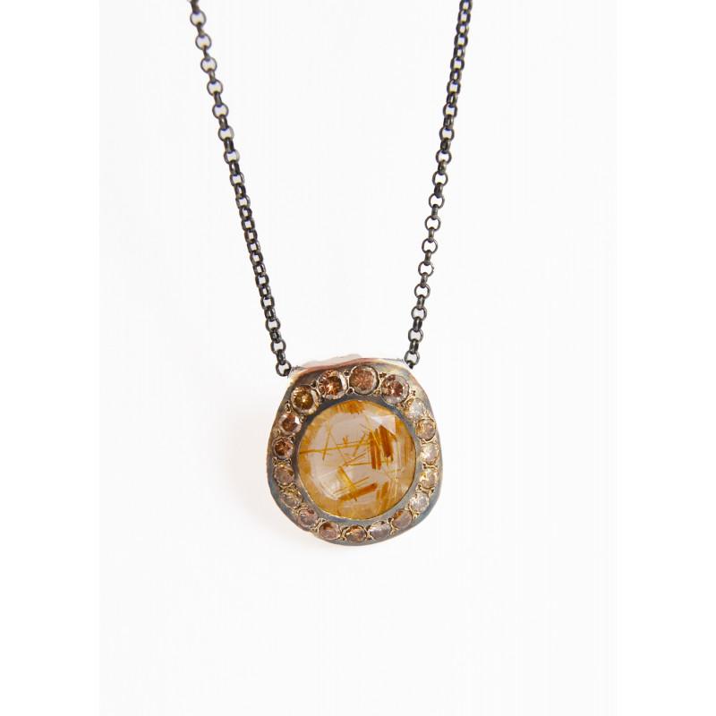 Necklace in sterling silver, Golden rutilated quartz with pendant in cognac diamonds Rosa Maria in silver set with diamonds. Rosa Maria jewelry is a bold blend of ethnic inspiration and raw industrial spirit.