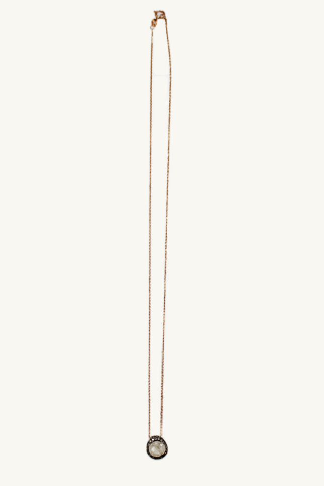 Rosa Maria 18k gold necklace with white quartz pendant and cognac diamonds set in silver. Rosa Maria jewellery is a bold blend of ethnic inspiration and raw industrial spirit.