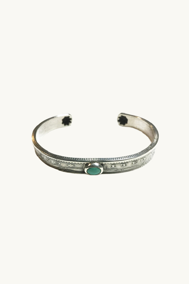 Its design, inspired by US dollars, is enhanced by a centrally set turquoise stone, adding a refined and original touch.