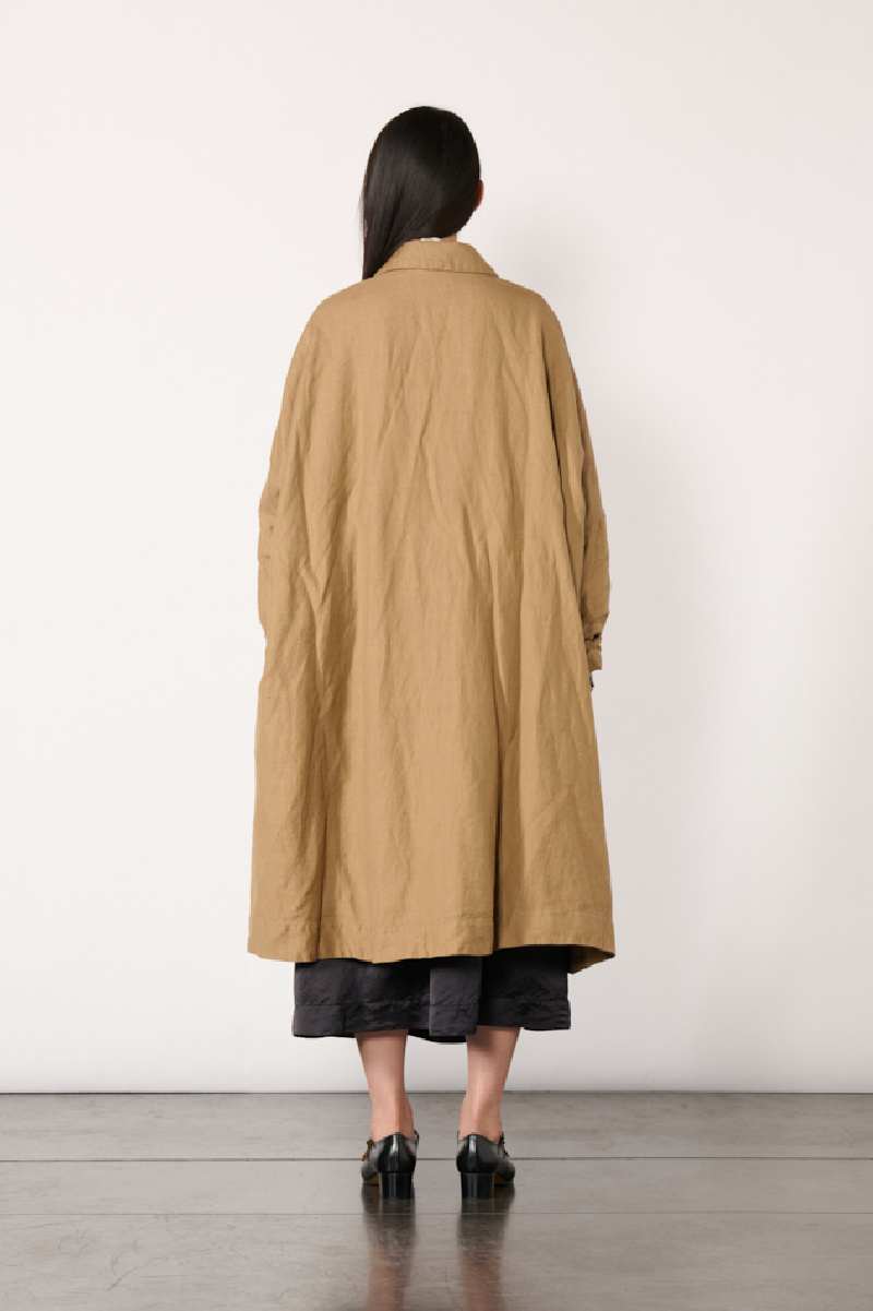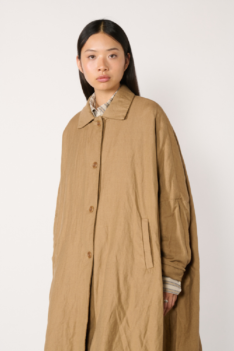 Long Atomless coat in latte color, made from wool and linen, by Casey Casey.
