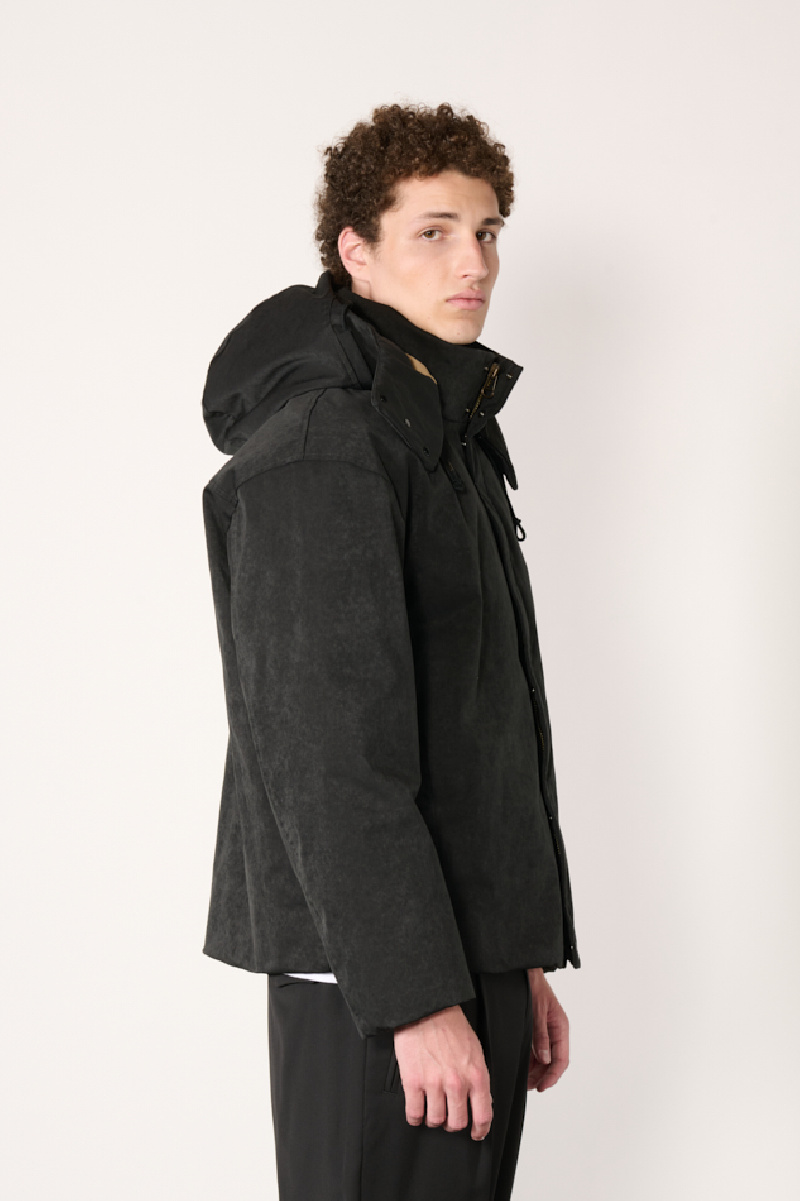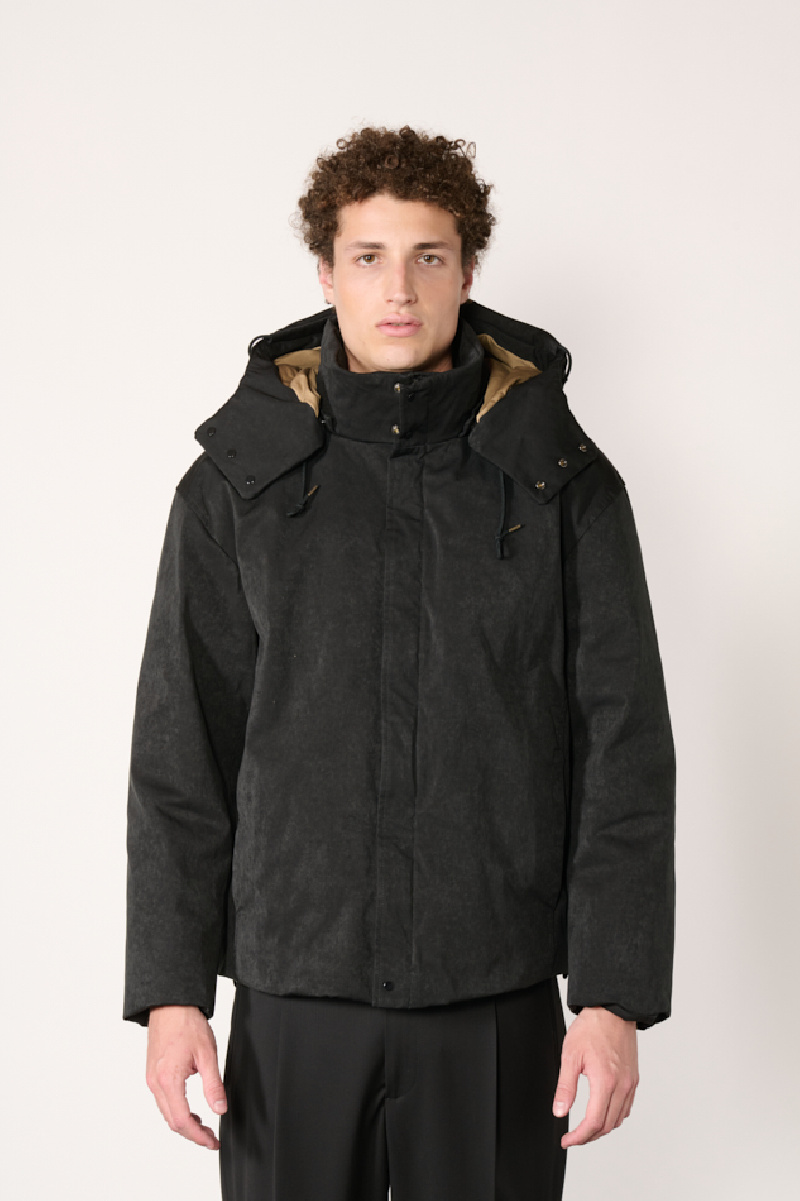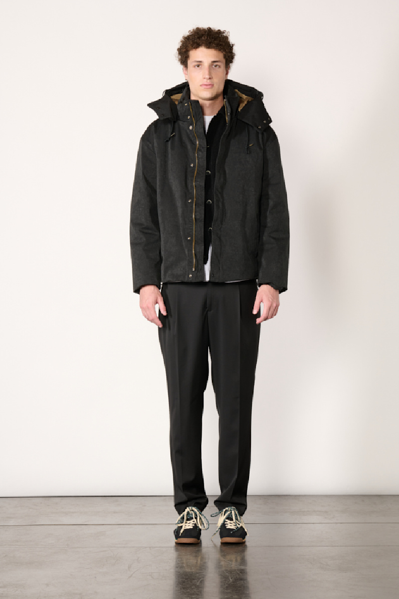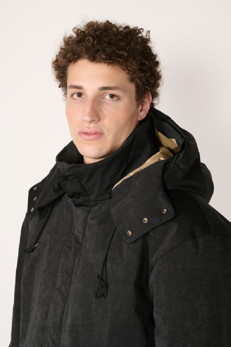 It features a straight cut with a zip fastening, a high collar with chin guard, and a hood.