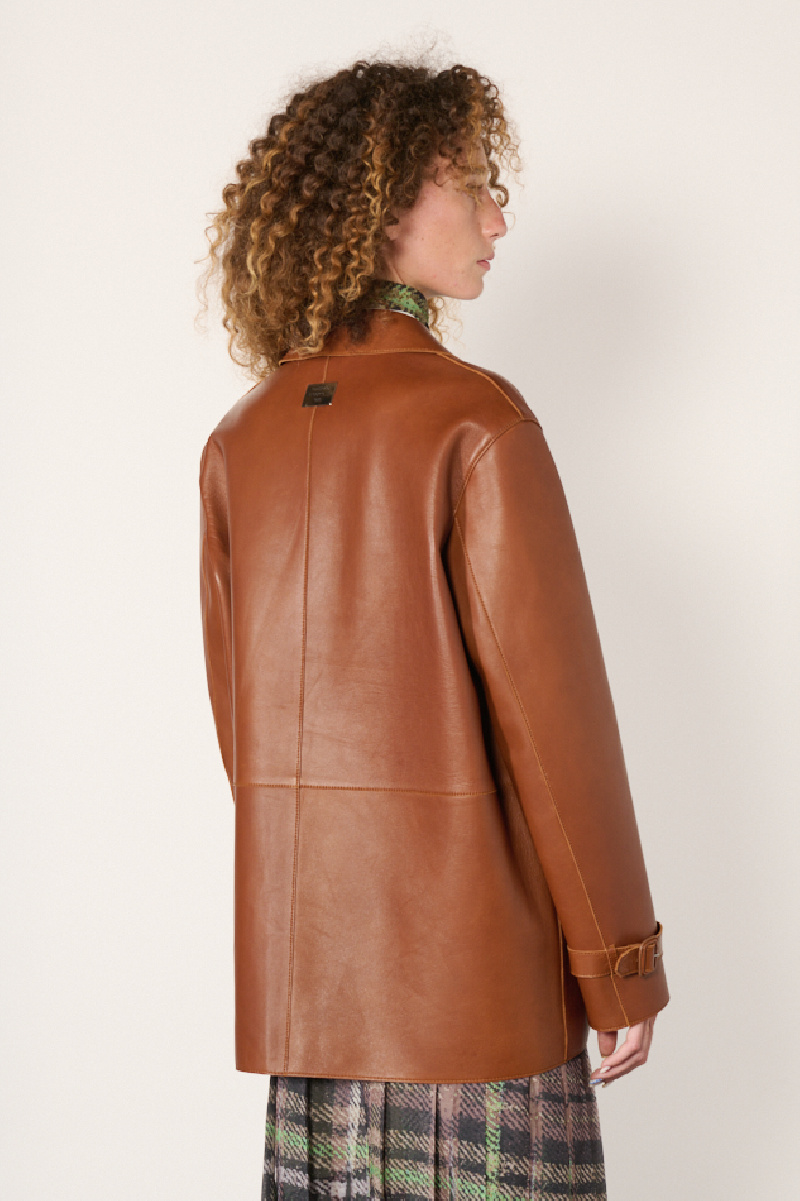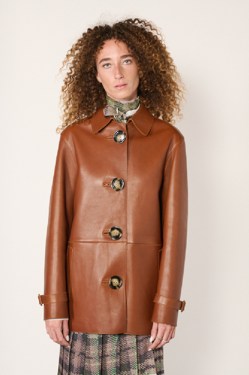 Car coat-style jacket made from high-quality, smooth and supple cognac-coloured lambskin leather by Acne Studios.