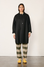 It features a loose, mid-length fit, a collar that can be worn up, a two-button closure, and side seam pockets.